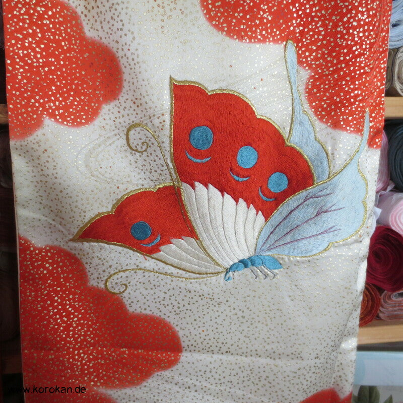gestickte Schmetterlinge im goldenen Schneeschauer Seidendamast Furisode Kimono