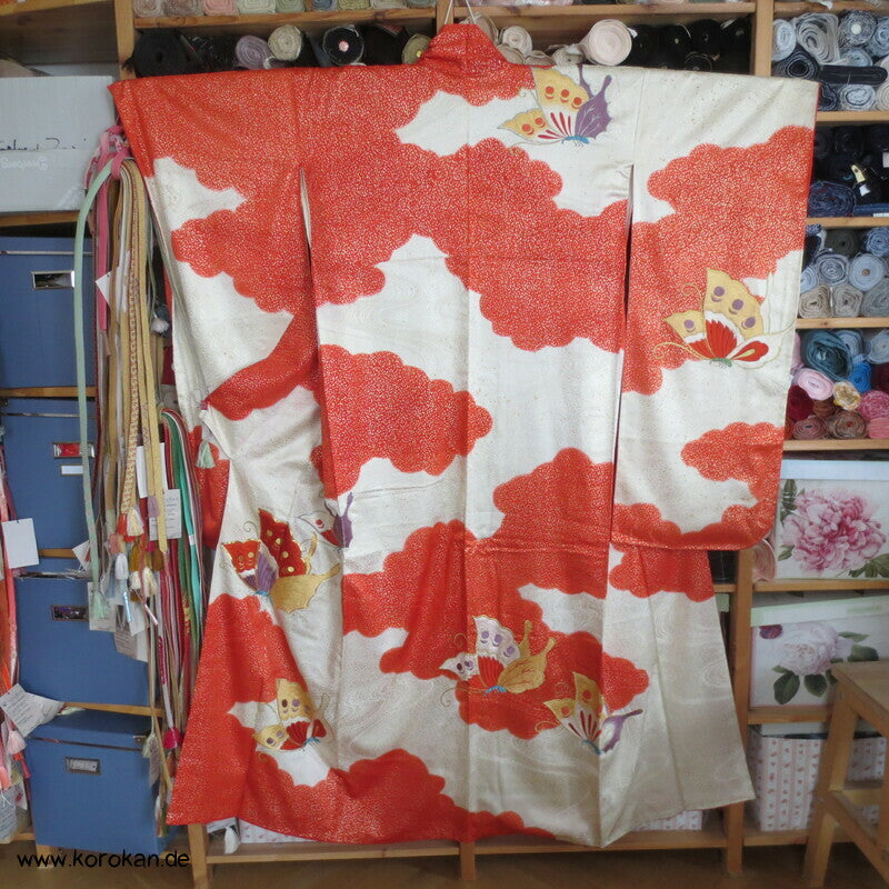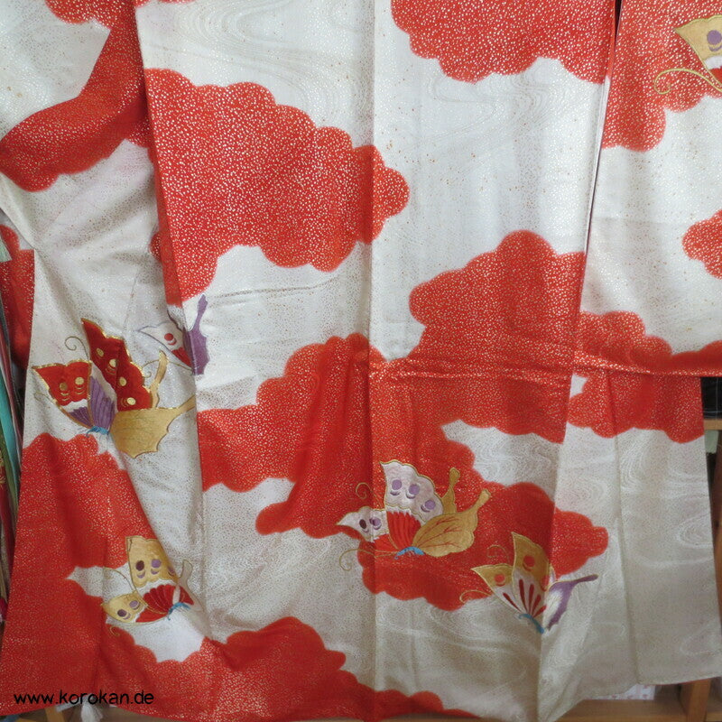 japanischer Vintage Furisode Seidendamast Kimono Abendwolken im goldenen Schneeschauer mit gestickten Schmetterlingen