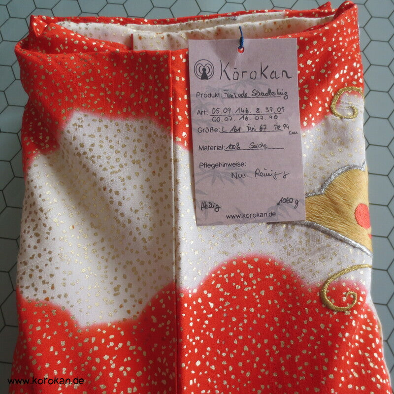 guter Zustand, heile, sieht aber aus, als hätte er Flecken, weil die Goldpunkte teils abgefallen / abgenutzt sind, so dass dort die Gutta Percha Klebe Basis irgendwie orange abfärbt. Nicht mehr für offizielle Anlässe, tolles Teil für Bühne, Cosplay, oder als Materiallager für die Stickereien
