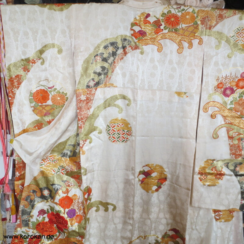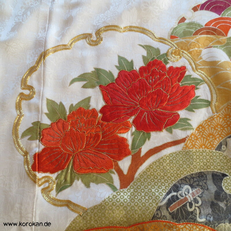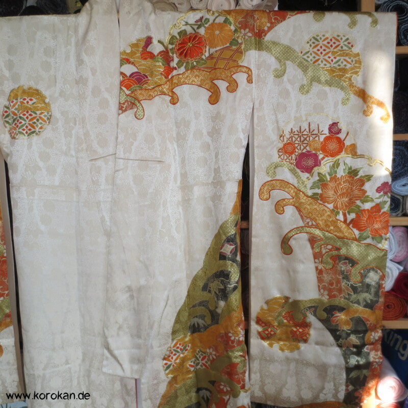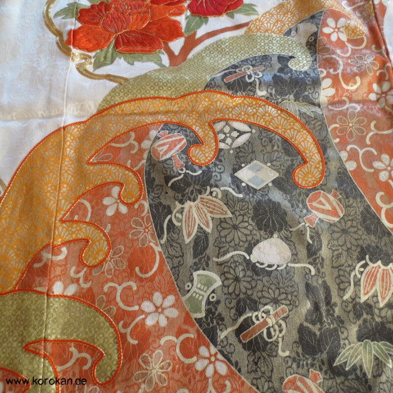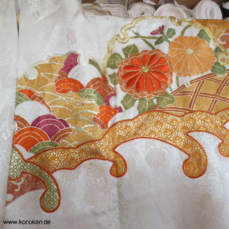 gestickte Wellen, Chrysanthemen, viele Details Seiden Furisode
