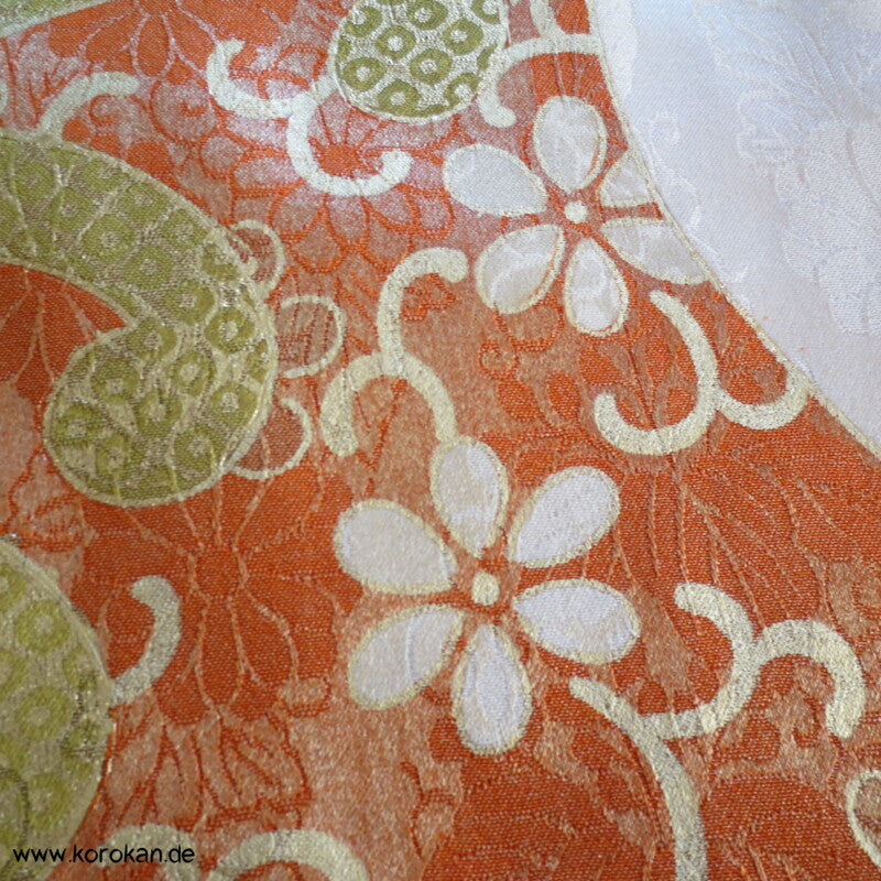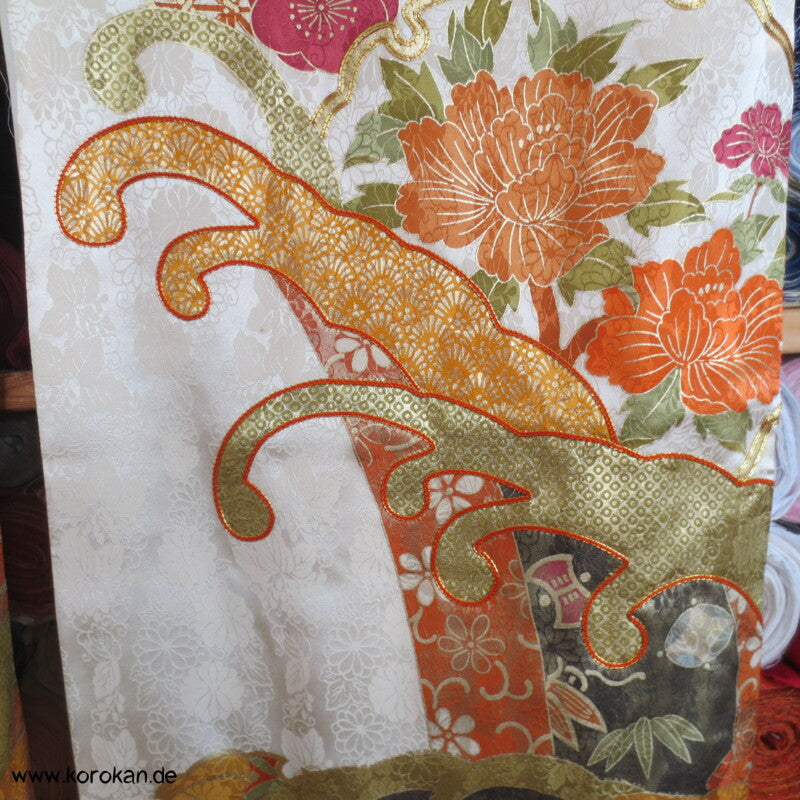 Vintage Furisode Blüten Seidendamast Kimono mit bunten goldenen Wellen, gold- /bestickt, oberes Futter helle Seide, unteres Hakkake Seidenfutter Obermaterial Seidendamast mit Bokashi Verlaufsrand.