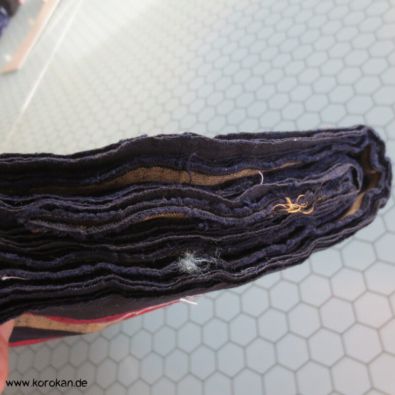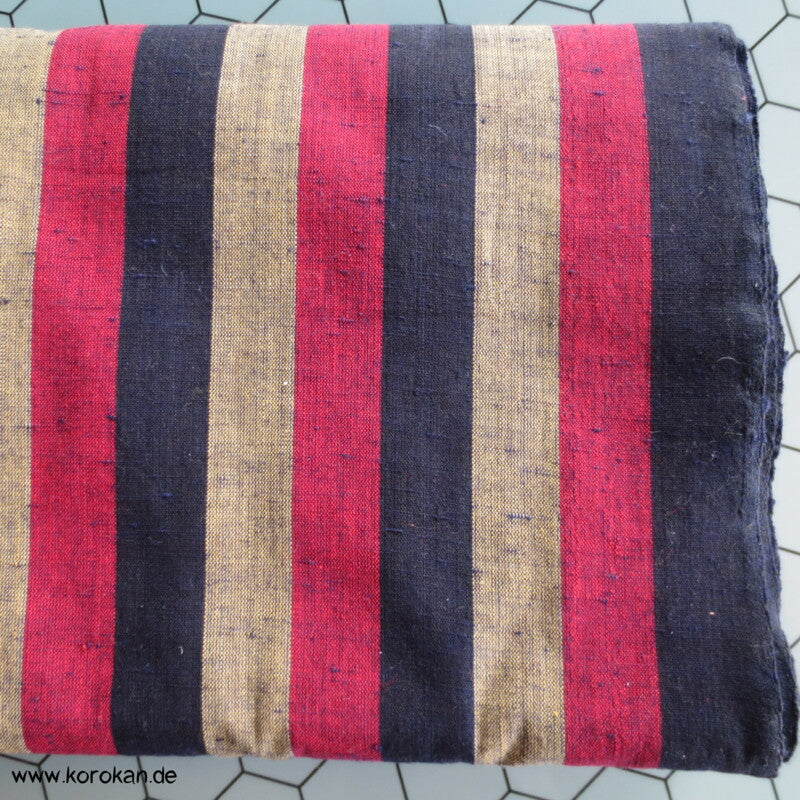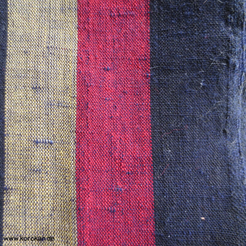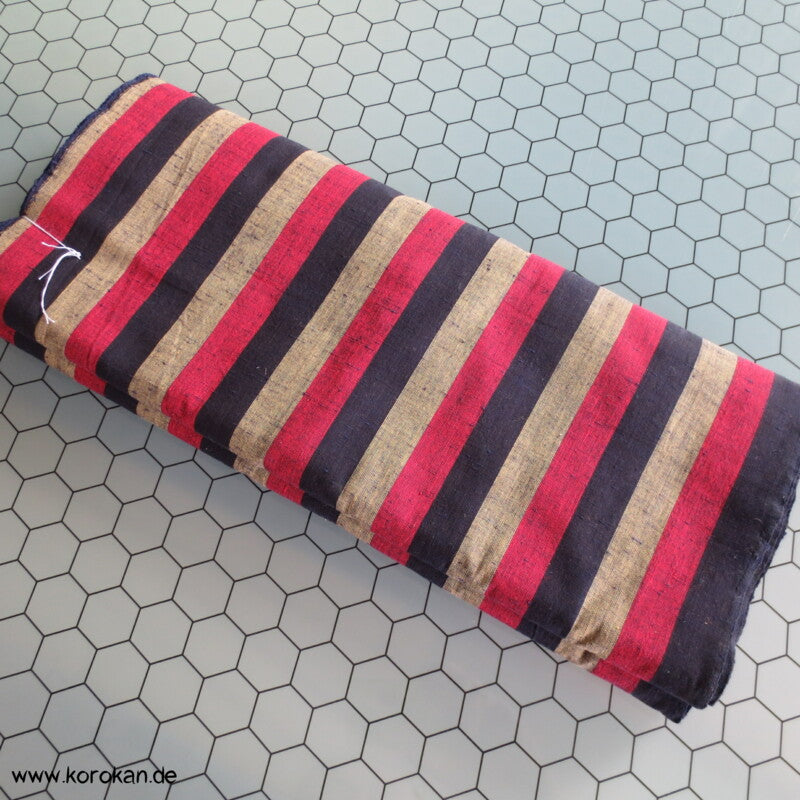 Vintage, eher schon antiker aufgetrennter Araihari Baumwolle Kimono Stoff mit schwarz rot gelben Streifen - wohl von einer Dochugi Arbeitsjacke oder sowas.