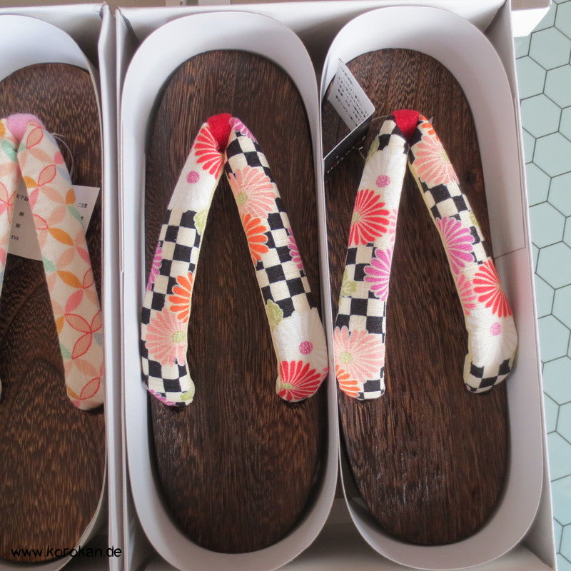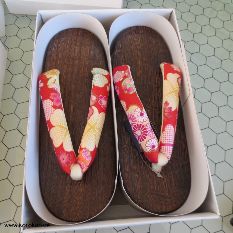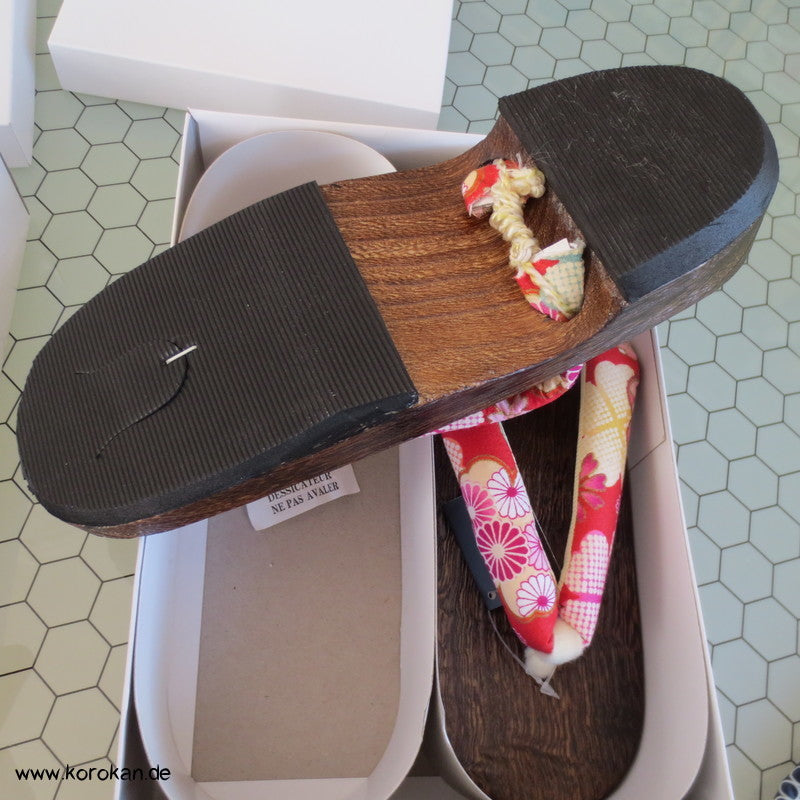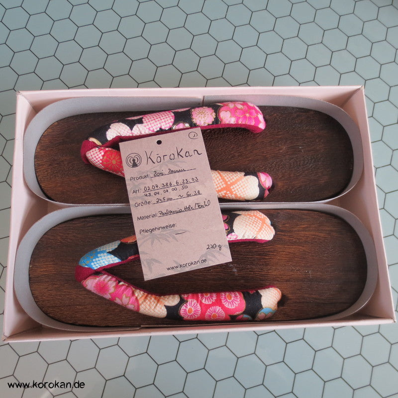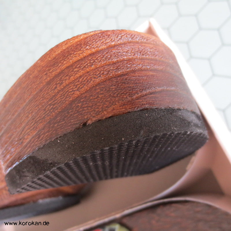 Vintage unbenutzte gedunkelte Paulownia Holz Geta Zehensteg Sandalen mit hellen Stoffriemen