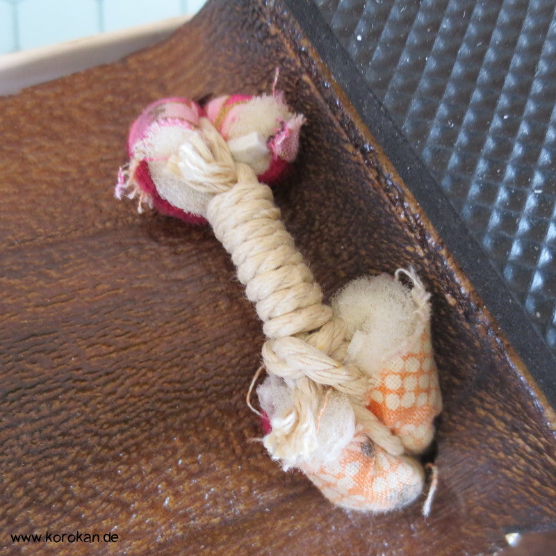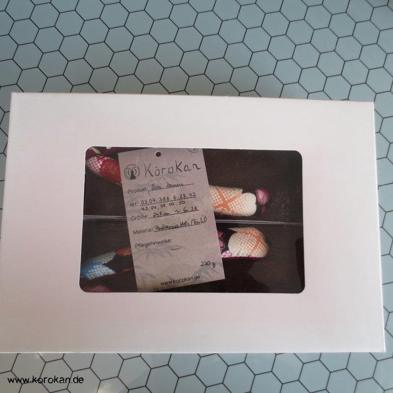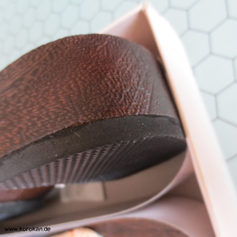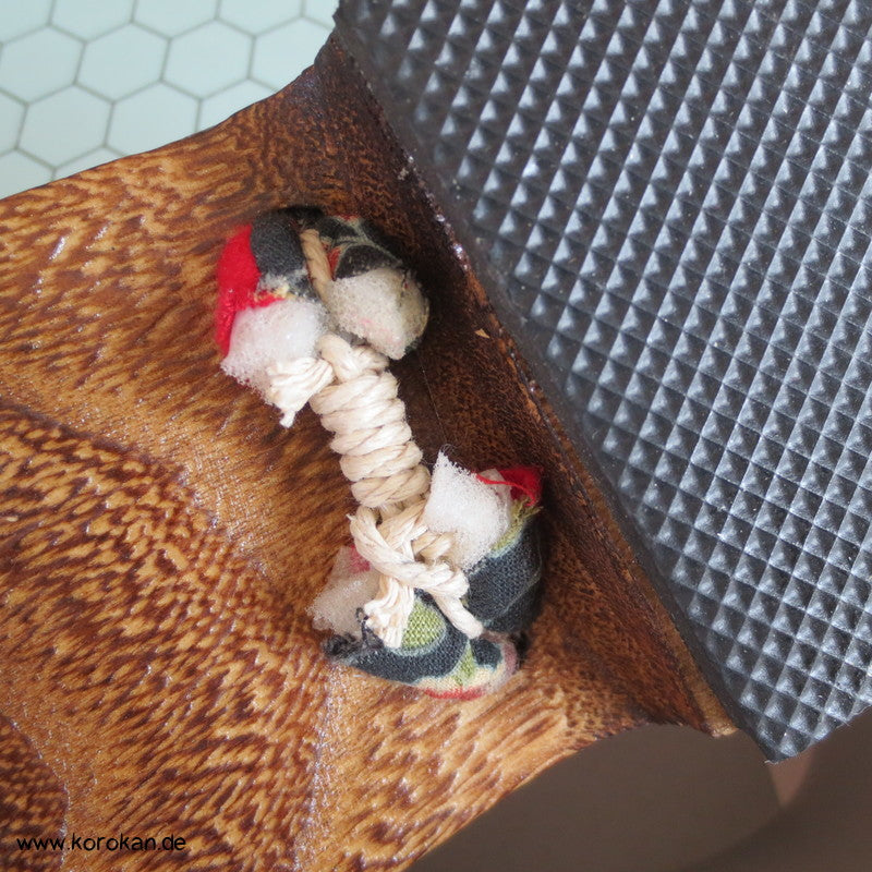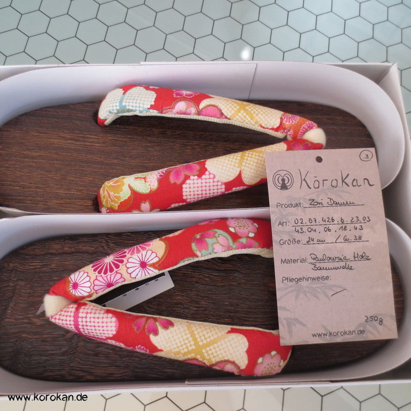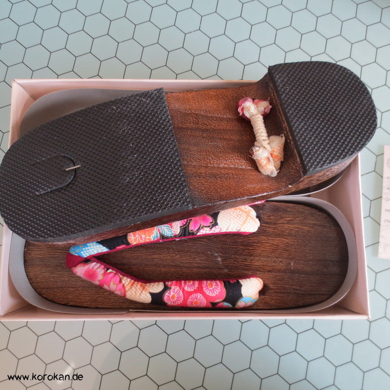 Vintage unbenutzte gedunkelte Paulownia Holz Geta Zehensteg Sandalen mit hellen Stoffriemen