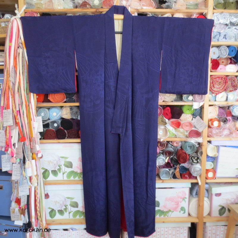 Vintage Seidendamast Iromuji Kimono gewebte Fächer und Blüten veilchenblau, hellem oberen Seidenfutter, unterem Seiden Hakkake fuchsiaroter Seidencrepe.