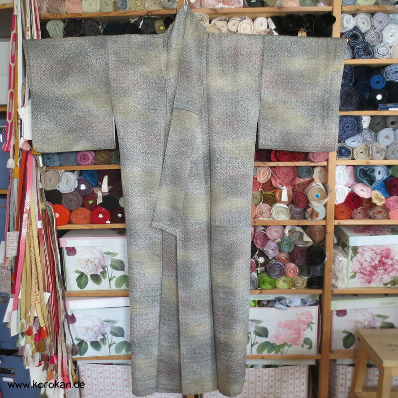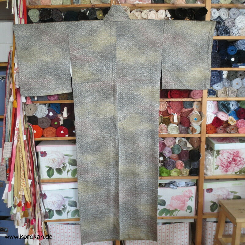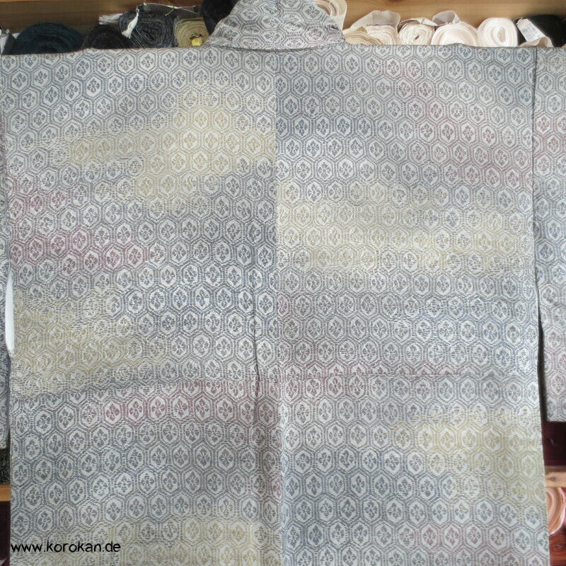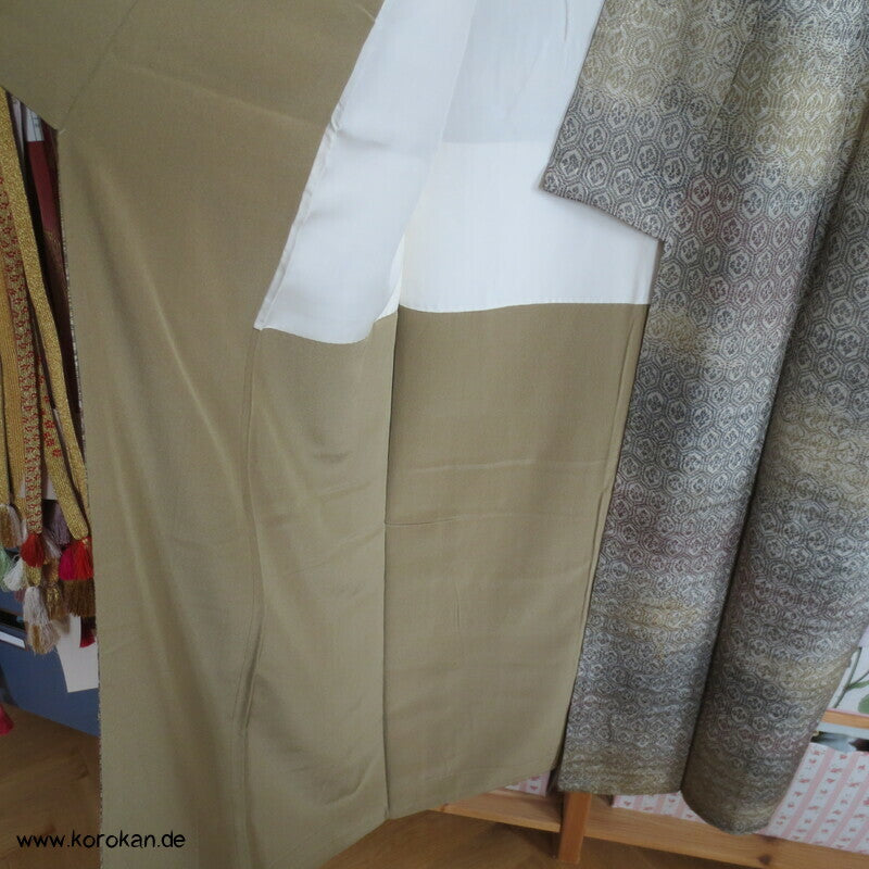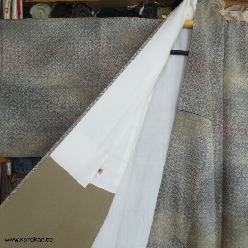 japanischer Vintage Komon Kimono Wellen Seidendamast mit Kikko Druck in Bokashi Farbverlauf, unteres Teilfutter khaki Seidencrepe, helles Seidenfutter oben