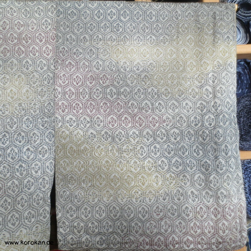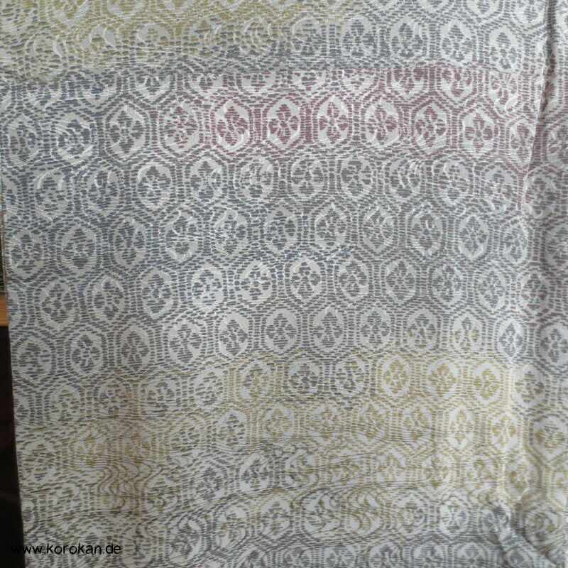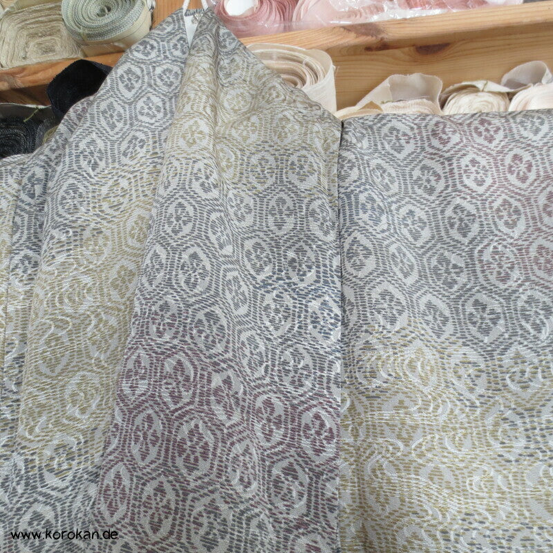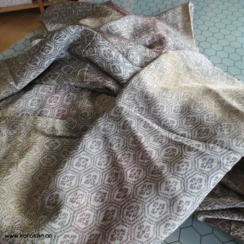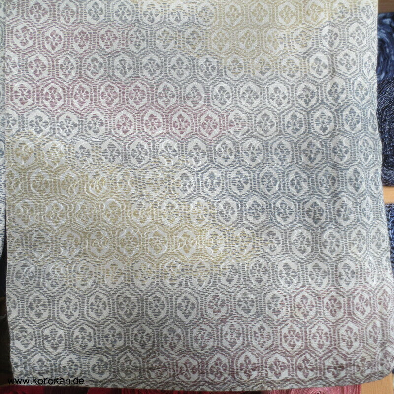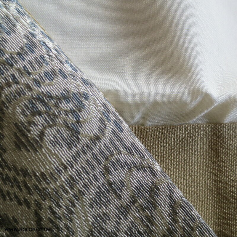 japanischer Vintage Komon Kimono Wellen Seidendamast mit Kikko Druck in Bokashi Farbverlauf, unteres Teilfutter khaki Seidencrepe, helles Seidenfutter oben