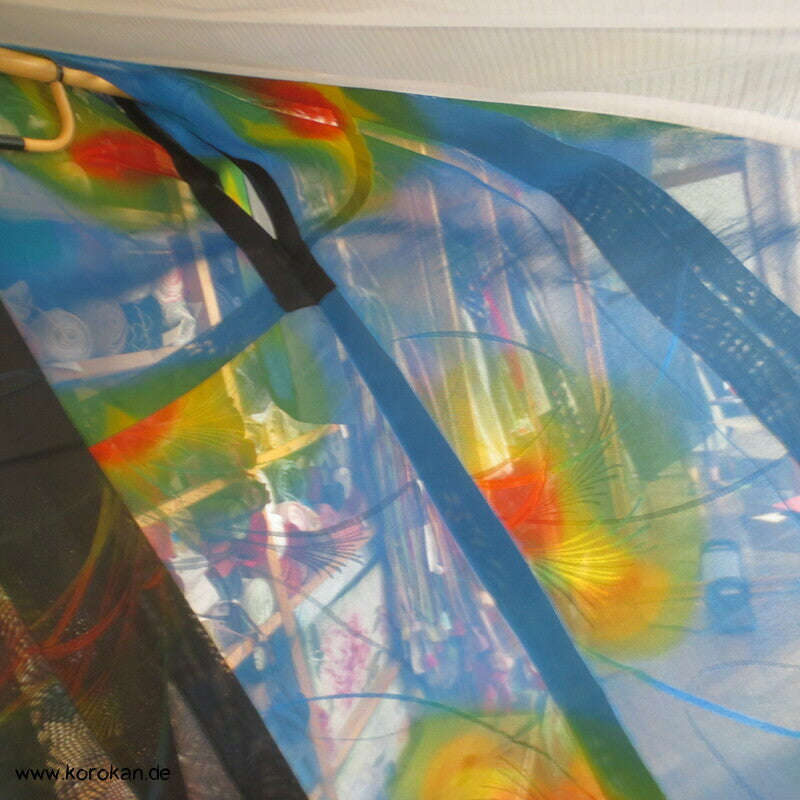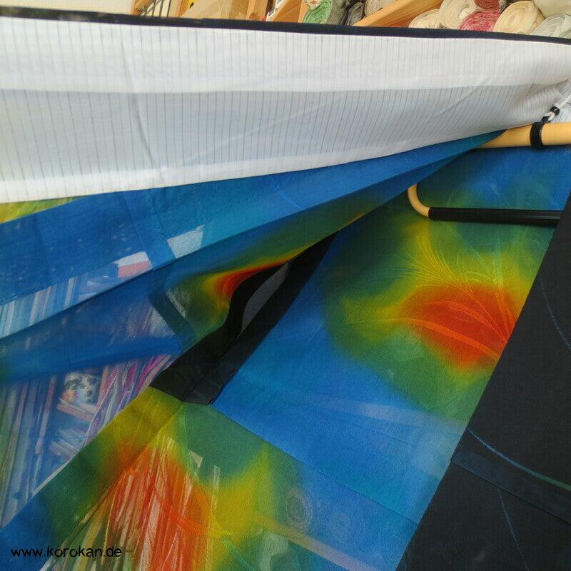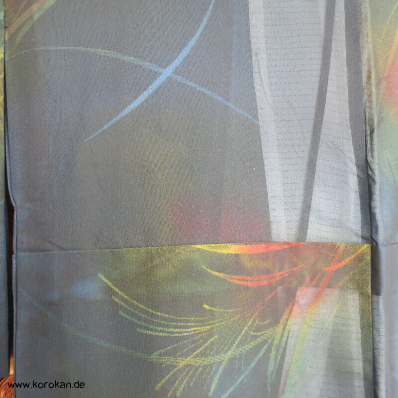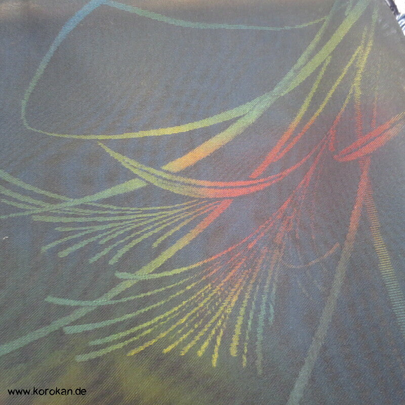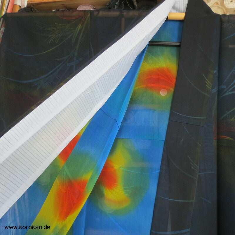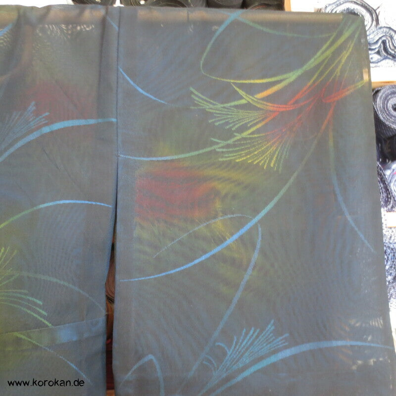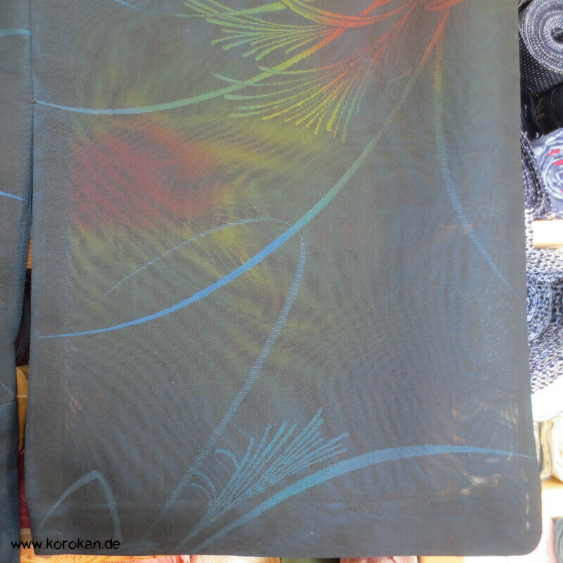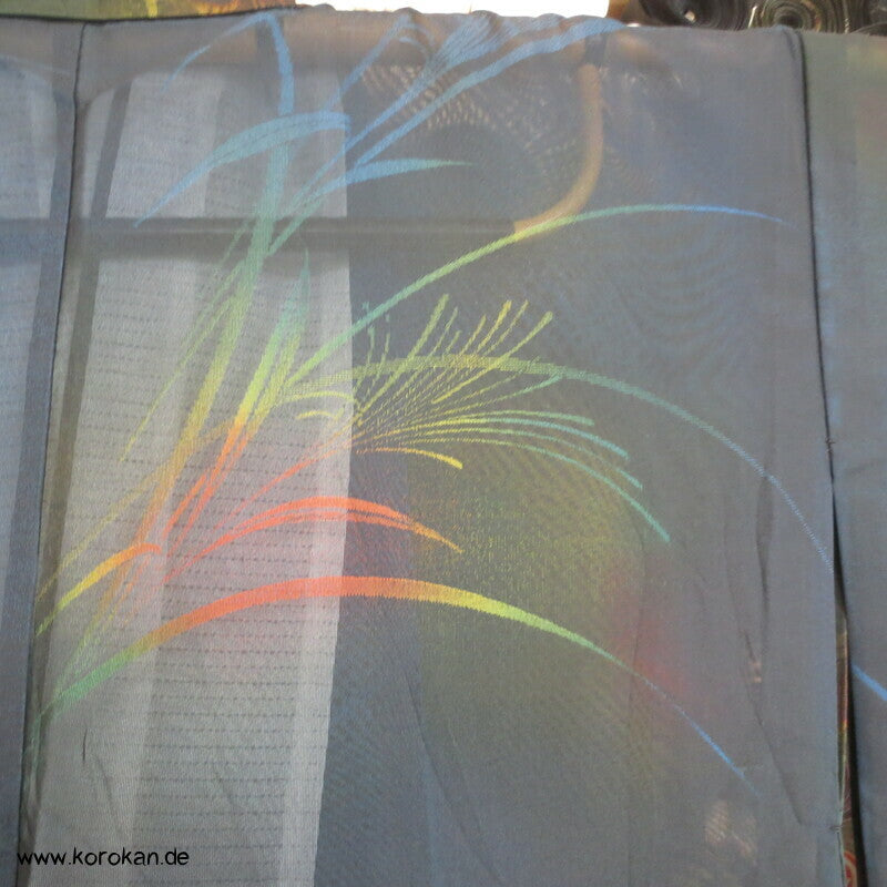 Vintage Sha Muster Drehergewebe Seide Kimono dunkelblau eingewebte Gräser in bunt, für den Sommer oder als Negligée