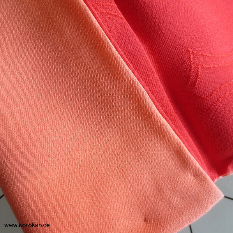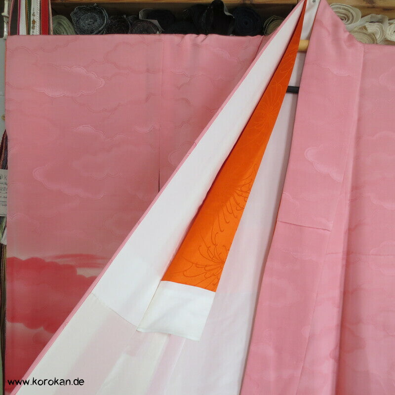 Vintage Furisode Seidendamast Kimono gewebte und gemalte rot rosa Wolken Morgenröte, oberes Futter helle Seide, unteres Hakkake Seidenfutter mit orangenem Bokashi Verlaufsrand und Han Eri Rangiku Seidendamast