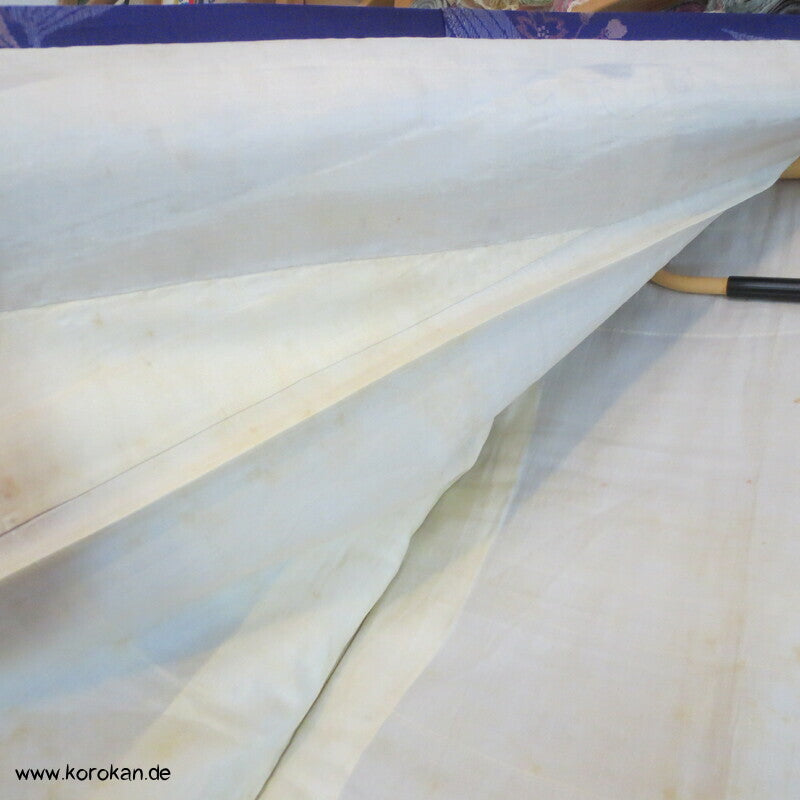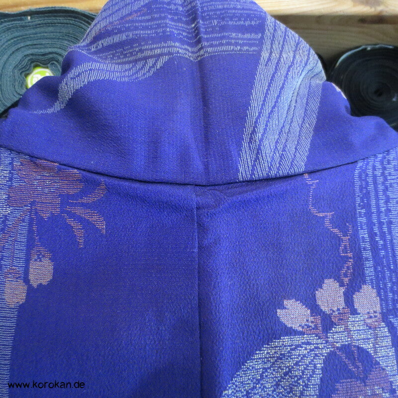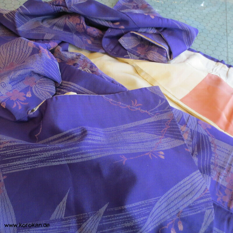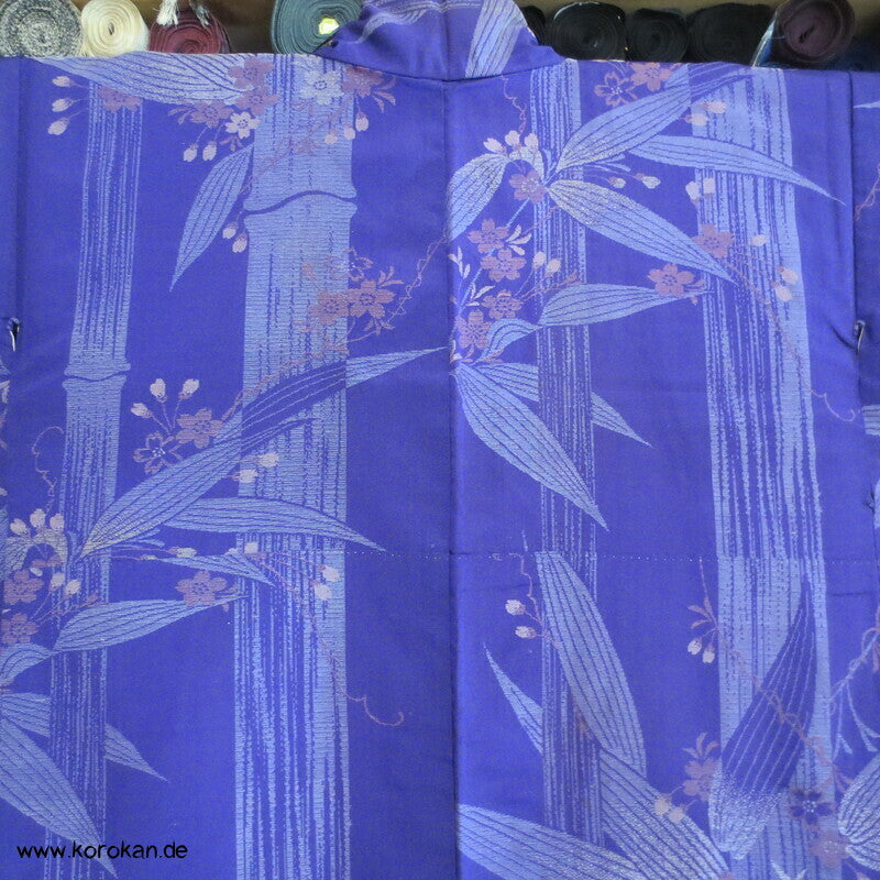 Vintage, eher antiker Komon Kimono glänzender Bambus und Urushi Blüten in violettblau Seidenbrokat / Jacquard, sehr 1950'er, eventuell früher, oberen hellen Seiden Futter und unterem Hakkake Futter in altrosa.