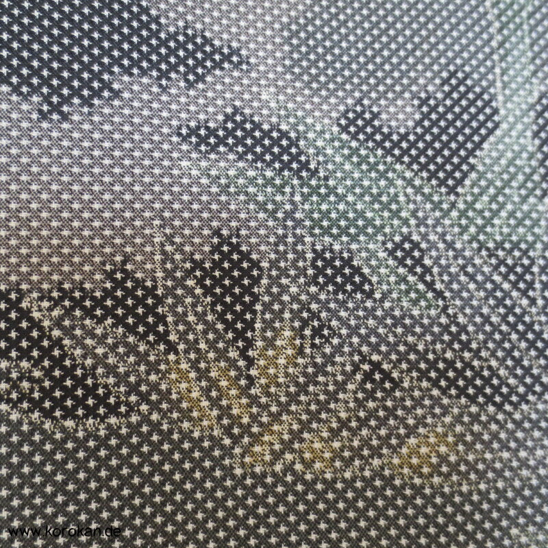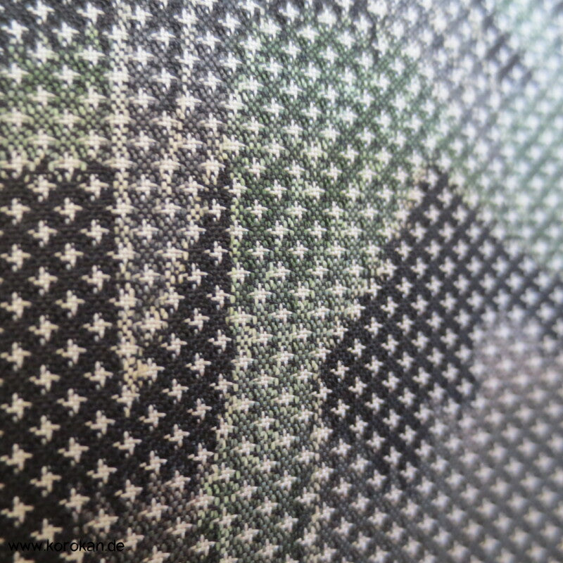 Vintage Tsumugi Seide Komon Kasuri Bambusmuster blau grau grün mit changierenden Farben, oberes Futter helle Seide, unteres Hakkake Futter Seide mit grünem Verlaufsrand