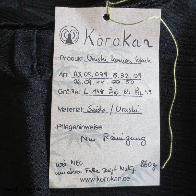 Vintage, japanischer 1950'er, eher antiker Komon Kimono Seiden Jacquard mit eingewebten glänzenden Urushi Blättern in schwarzen Wellen, oberen hellen zarten Seiden Futter und unterem Hakkake Futter Seidencrepe dunkelweinrot