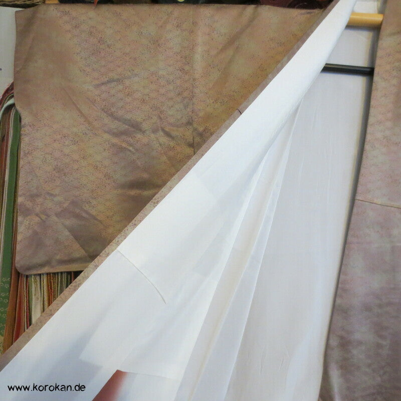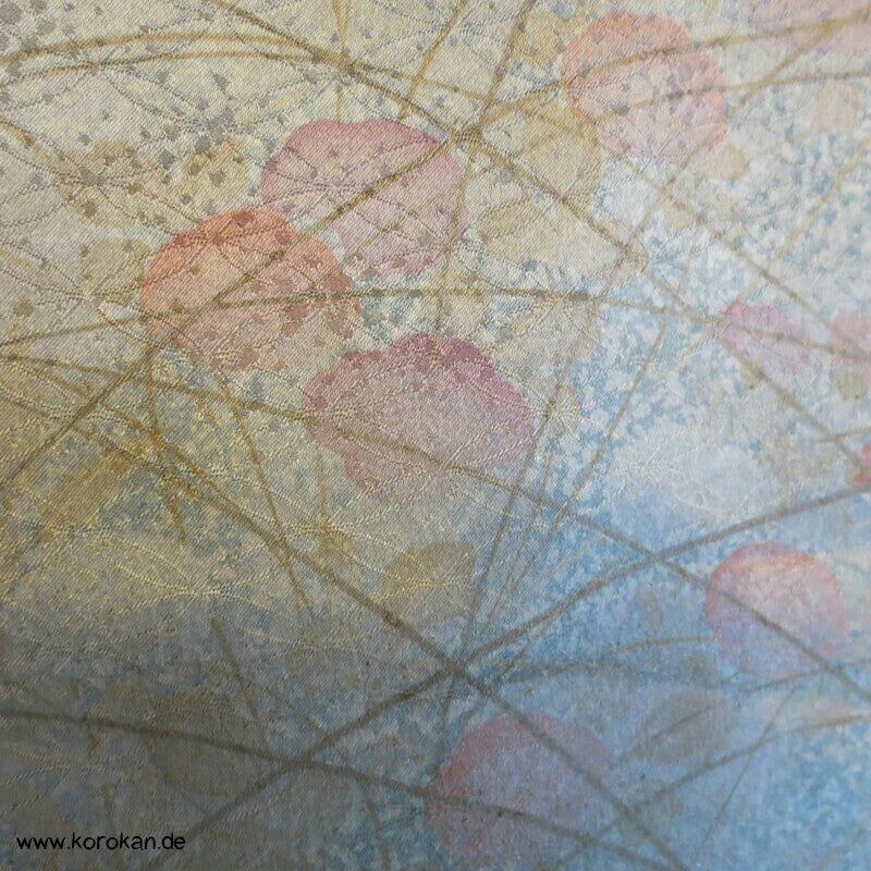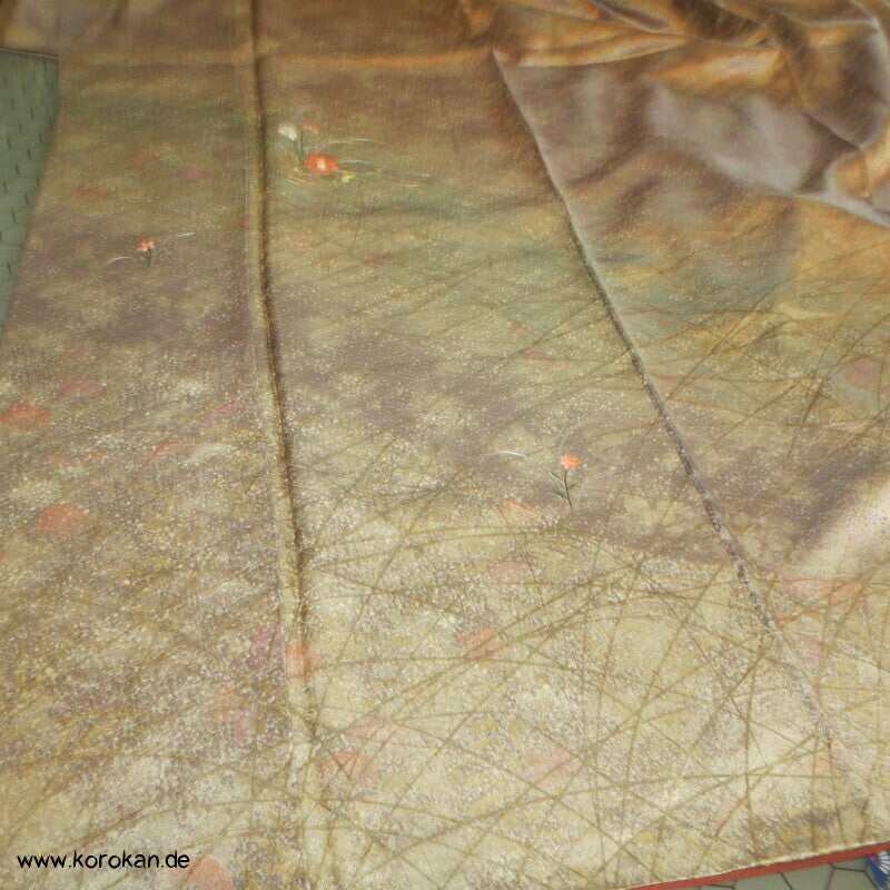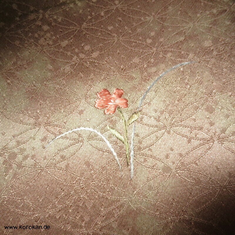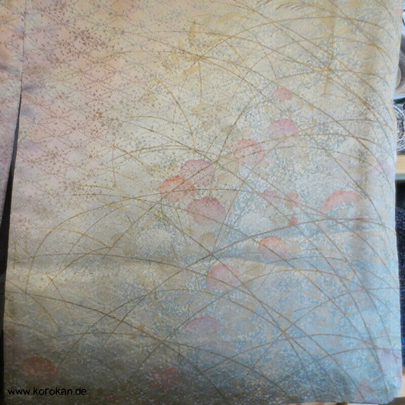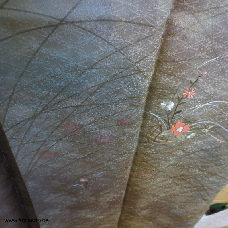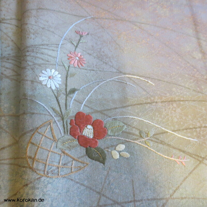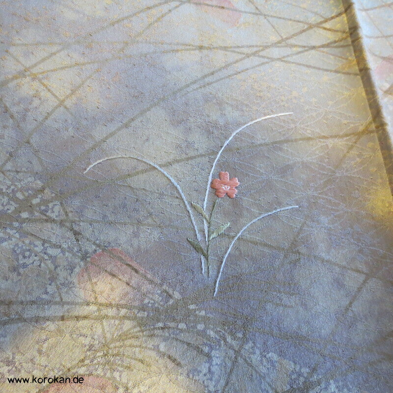 Vintage Homongi Kimono Shippo Seidendamast, bemalt mit bunten Blüten teilbestickt mit feinen kleinen Blumen, feinem oberen hellen Seidenfutter und unterem Hakkake Seidenfutter mit Bokashi Verlaufsrand.
