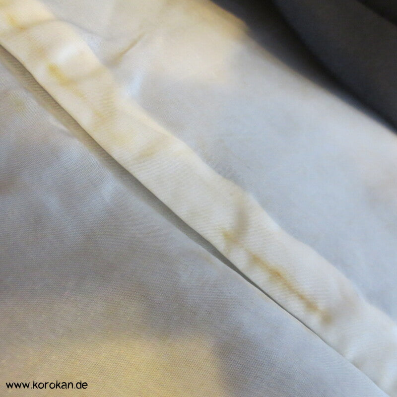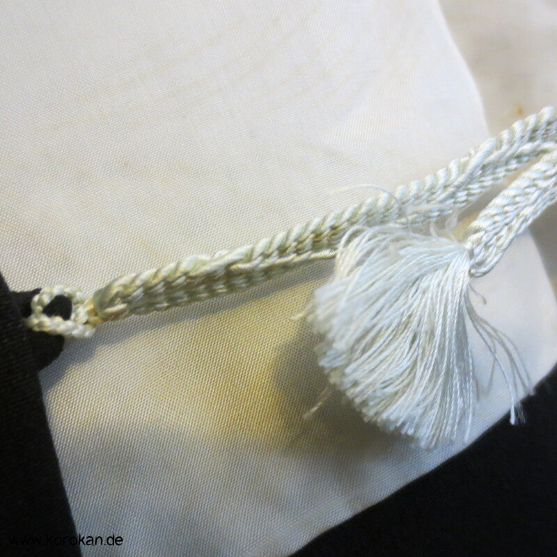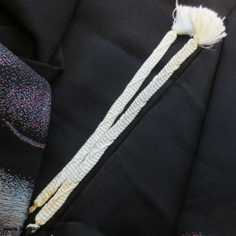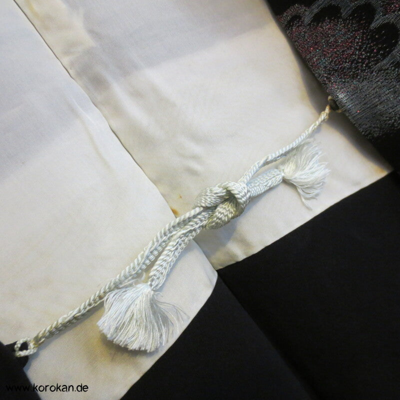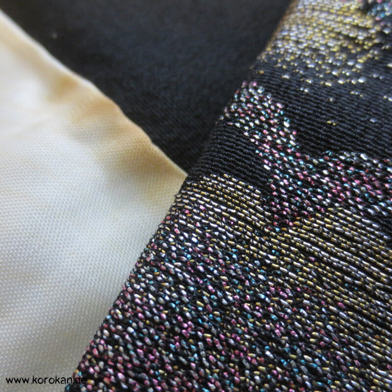 japanische Vintage, eher antike Haori Kimono Jacke aus feinem, schwarzgrundigen Seidenbrokat mit eingewebten Wolken in gold und Urushifäden und hellen Seidenfutter, mit Himo