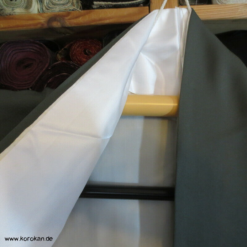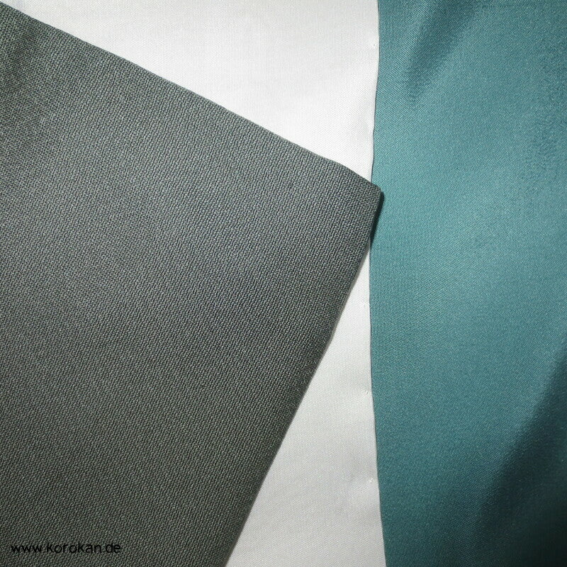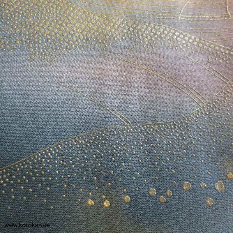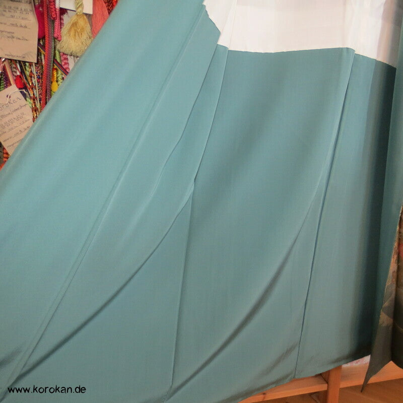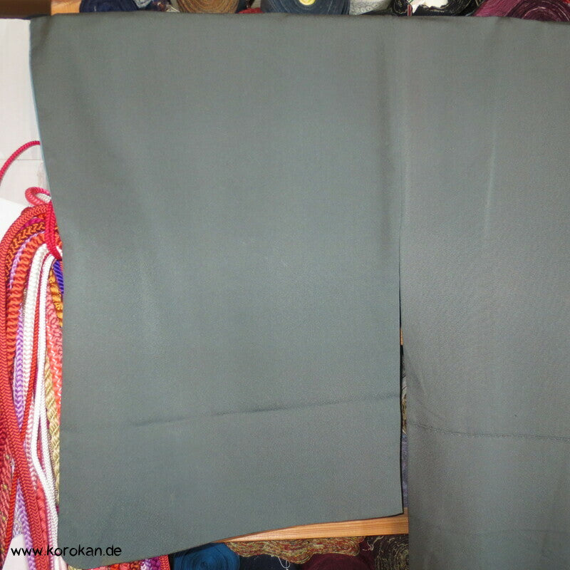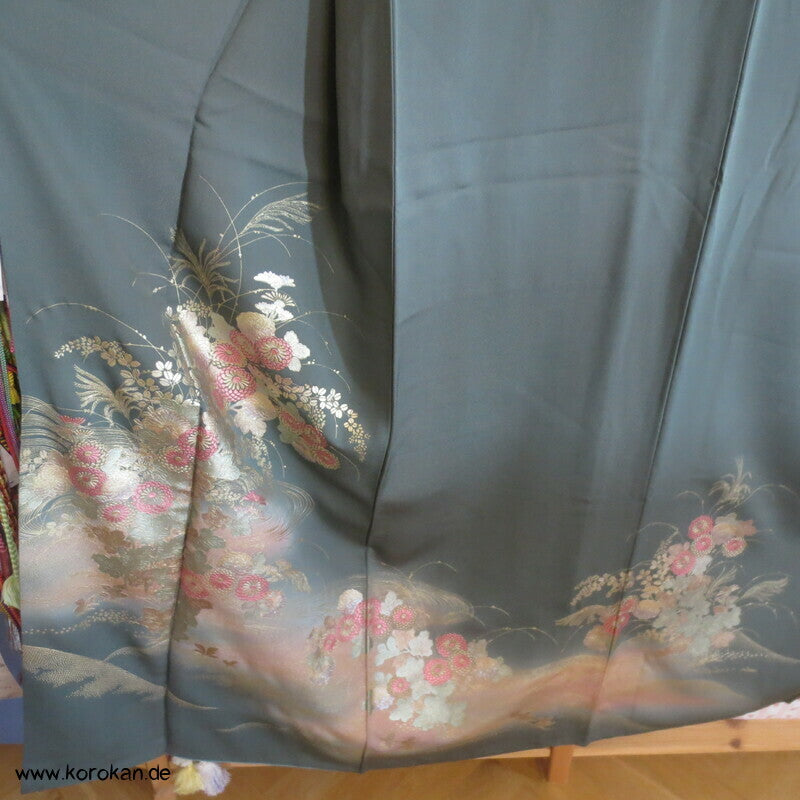 Vintage Homongi Kimono dunkelgraupetrol Seidencrepe, mit ganz viel Gutta Percha Malerei, feinem oberen hellen Seidenfutter und unterem Hakkake Seidenfutter