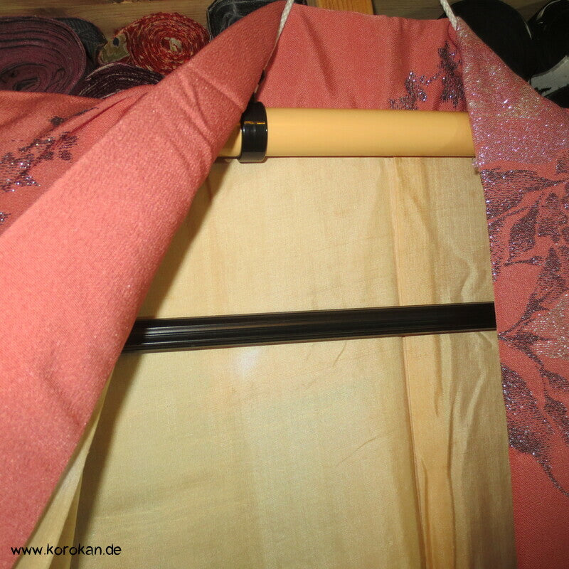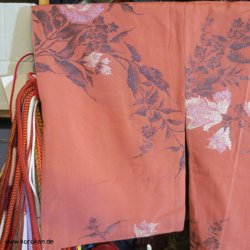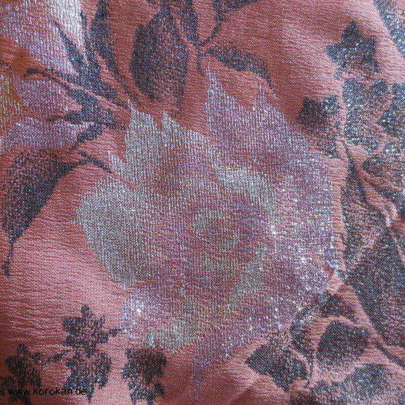 Vintage, eher antiker Komon Kimono glitzernde Rosen in altrosa Seidenbrokat / Jacquard, sehr 1960'er, eventuell früher, oberen hellen nachgedunkelten Seiden Futter und unterem Hakkake Futter in altrosa.