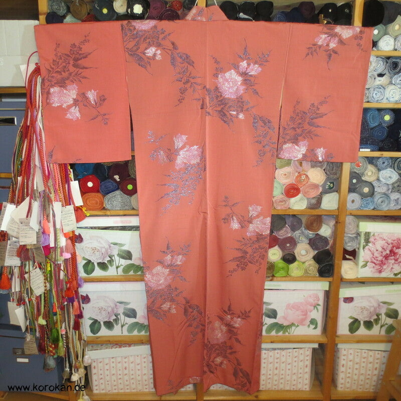 glitzernde Rosen auf altlachs Seidenjacquard 1960'er Komon Kimono