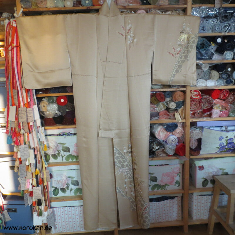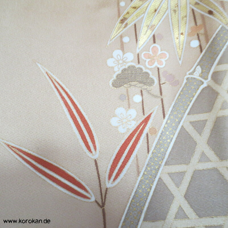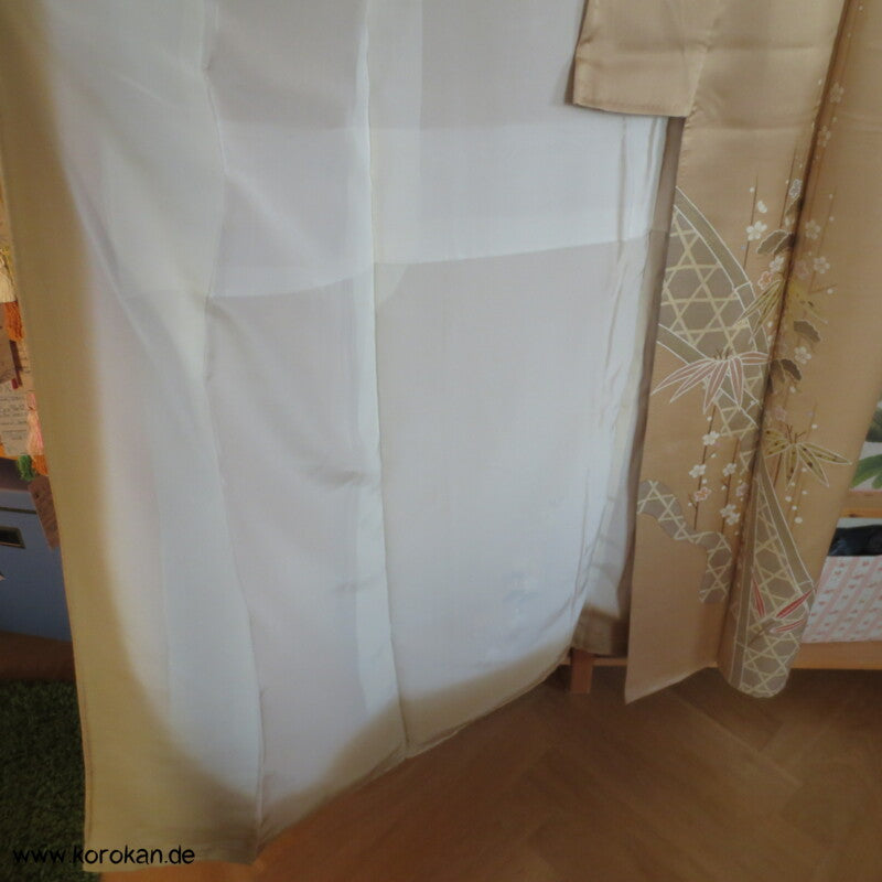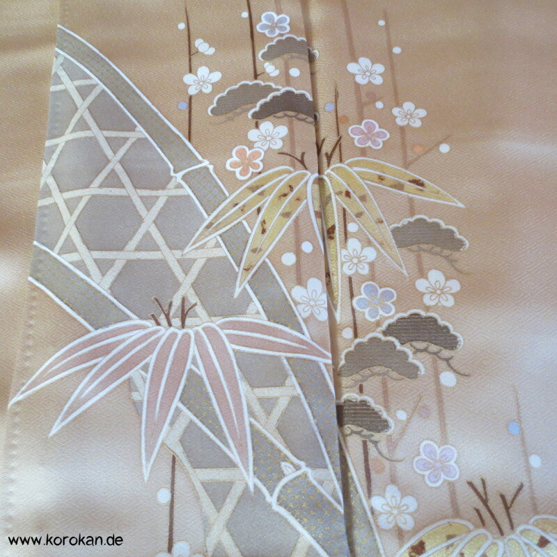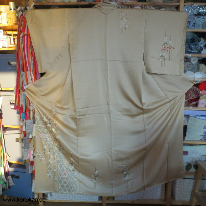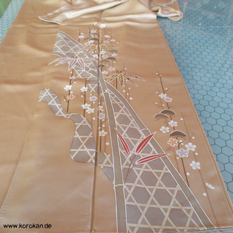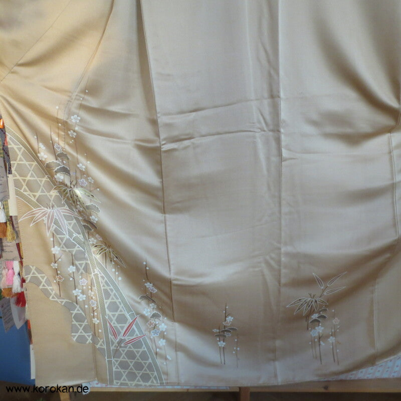 Homongi Kimono gold beige Seidendamast mit Bambusgitter und Blätter