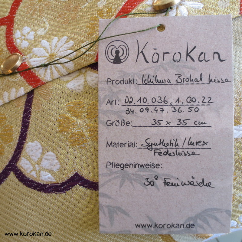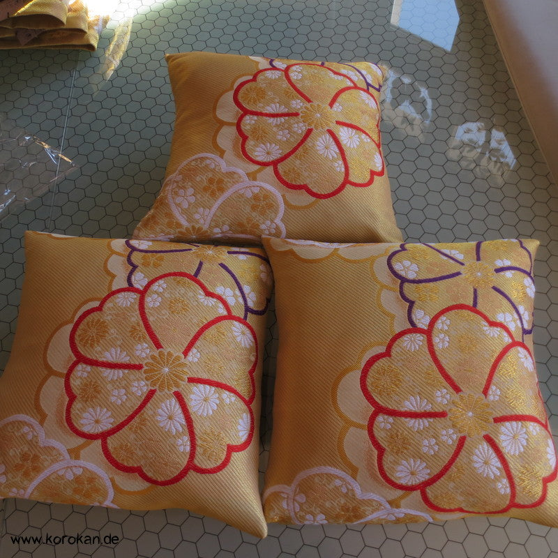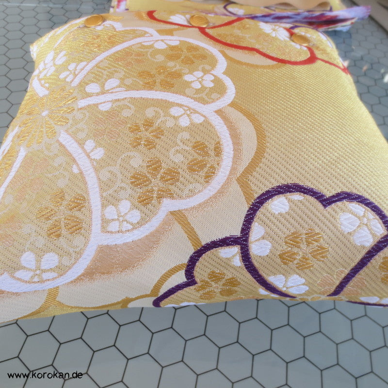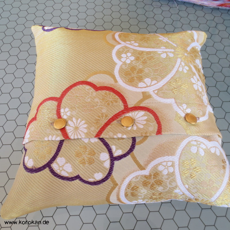 Prachtkissen 35 x 35 cm aus japanischen Kimono Obigürtel Ichikura Brokat, Umeblüten auf Gold