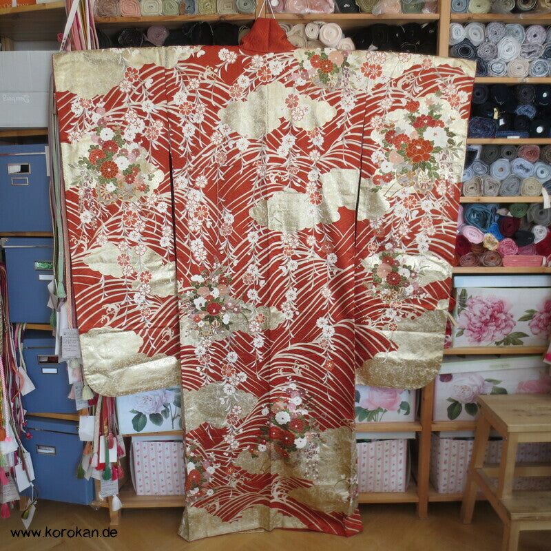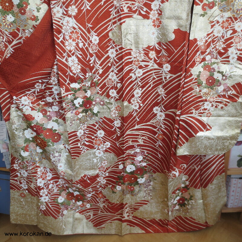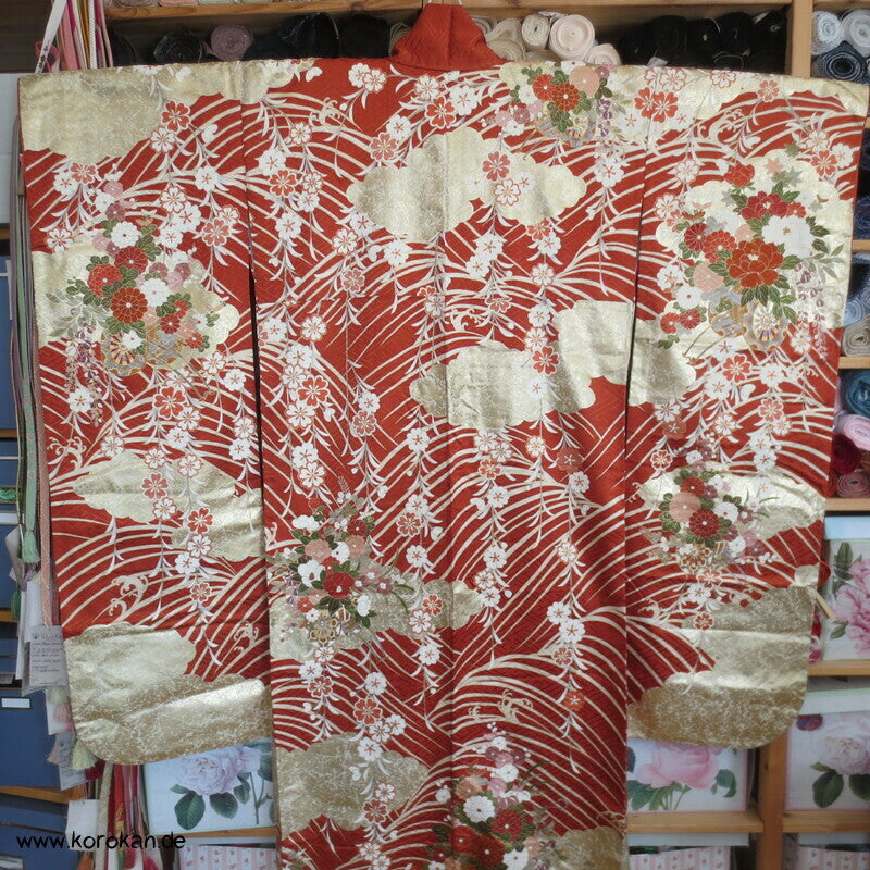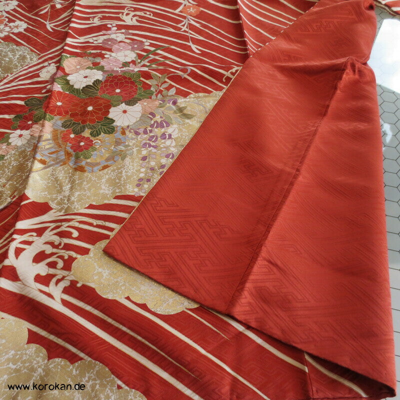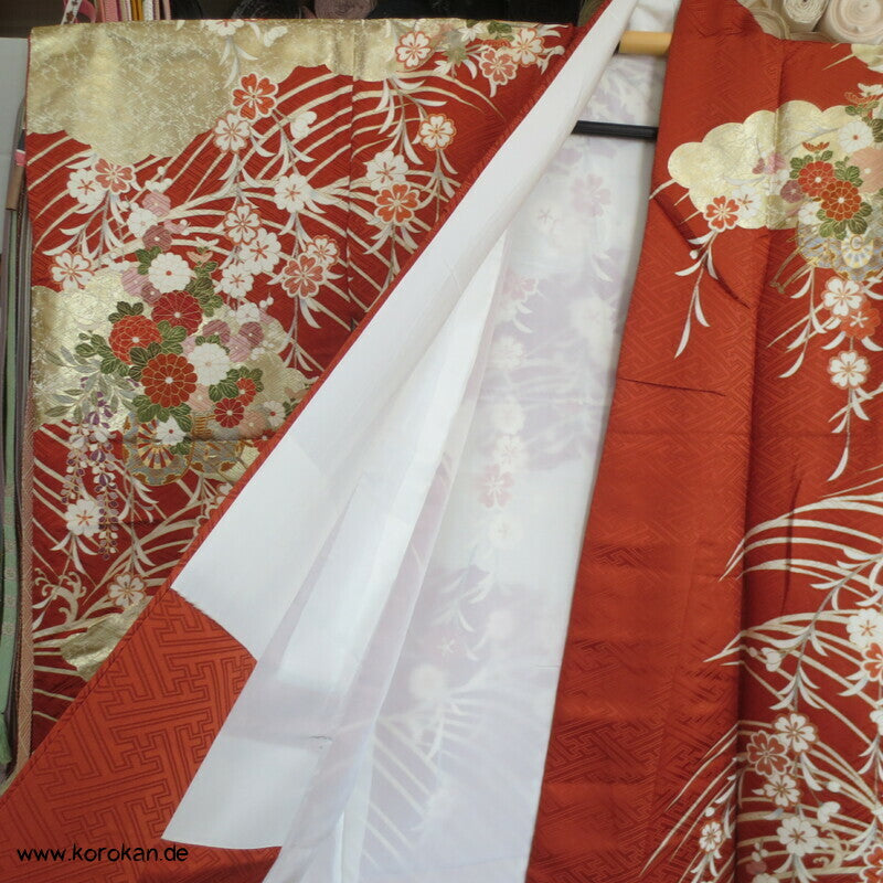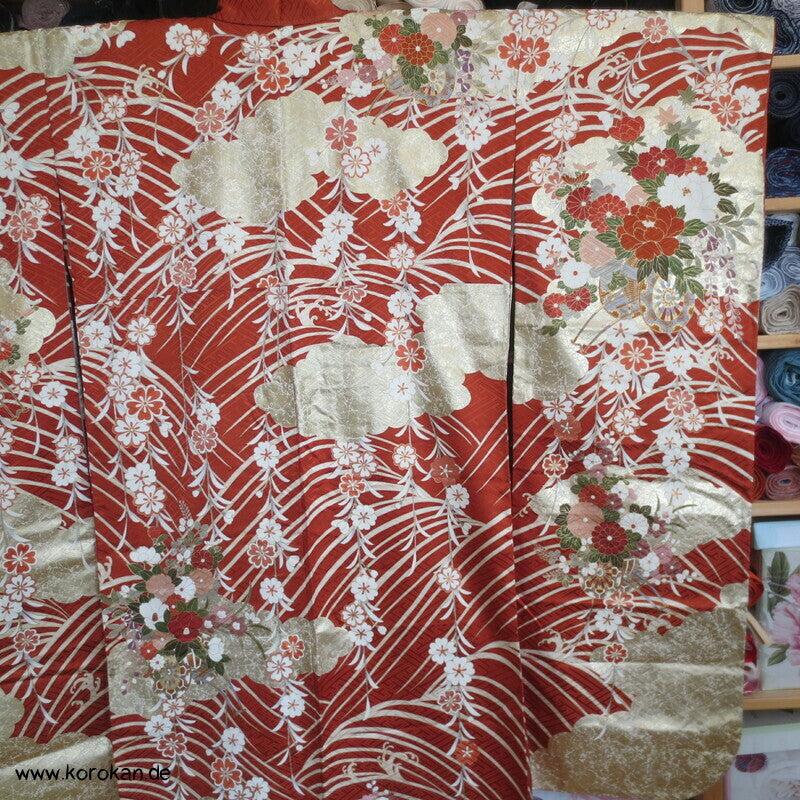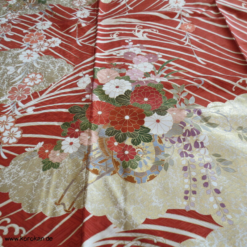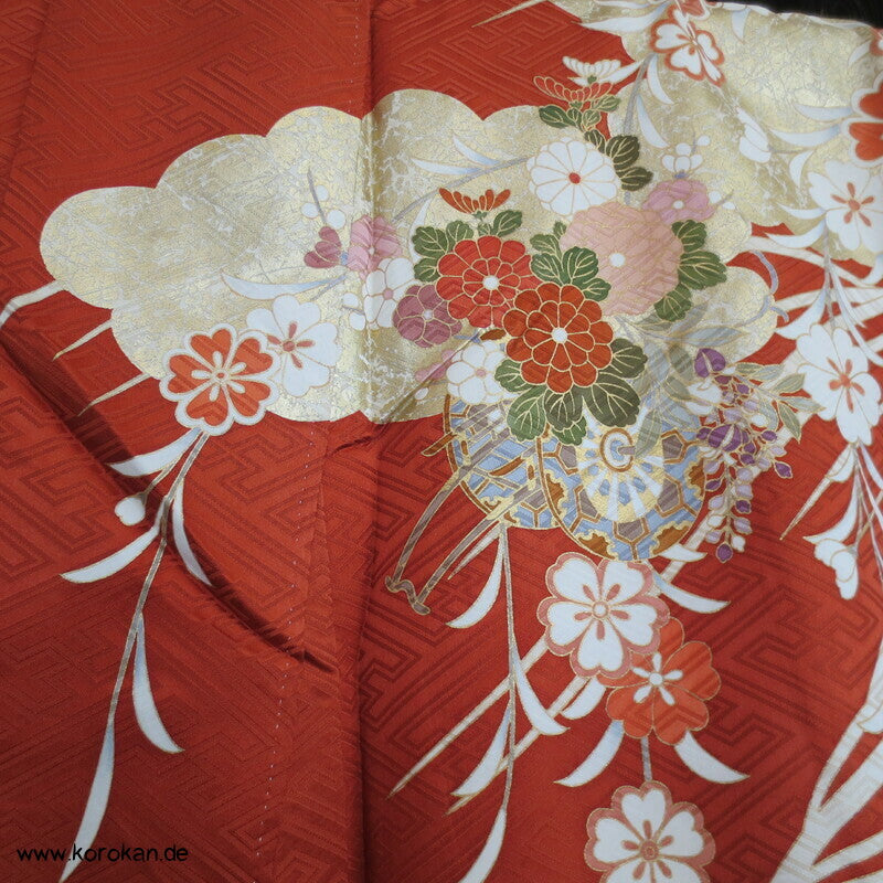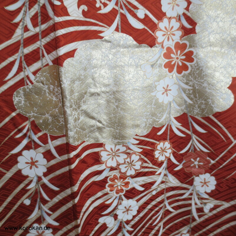 Furisode Kimono Golddruck /-stickerei Wolken, Blütenzweige auf Seidendamast