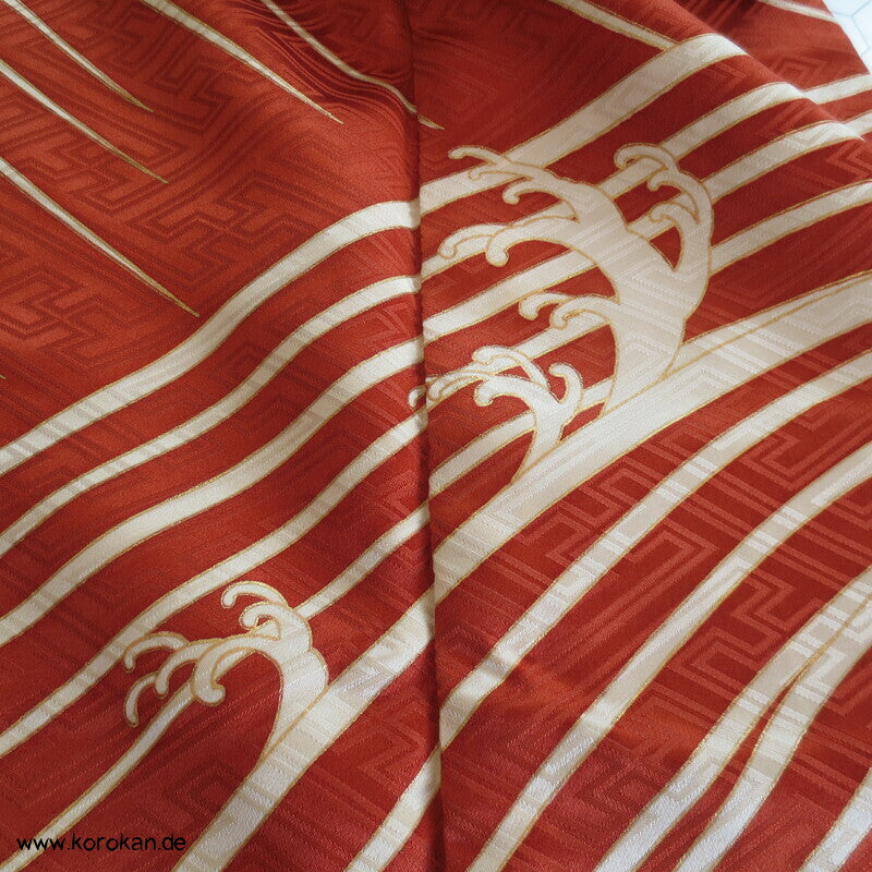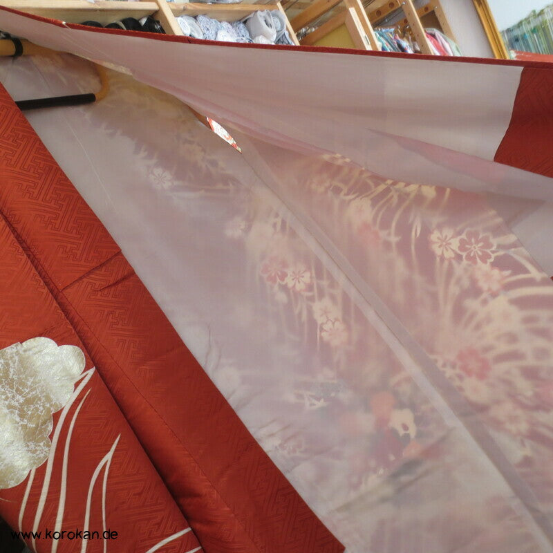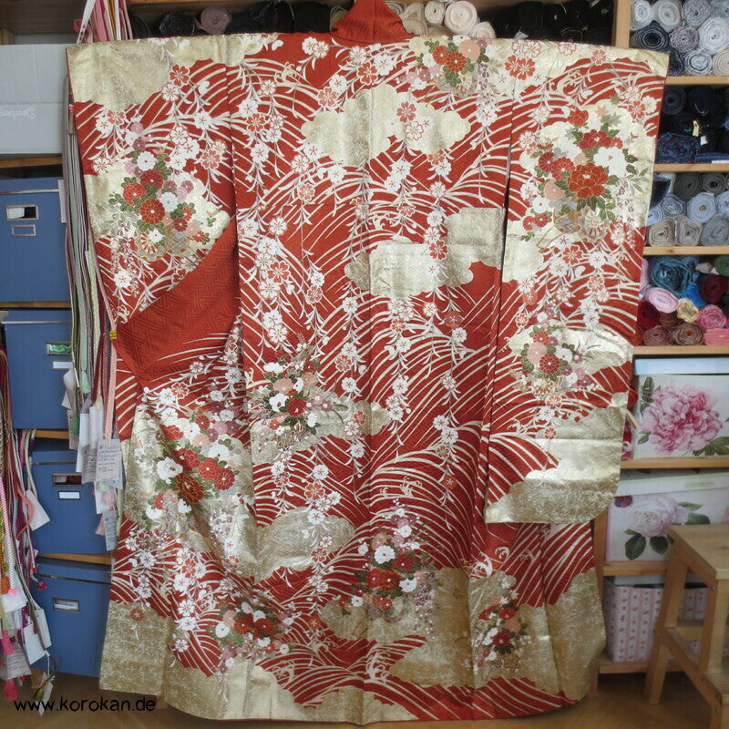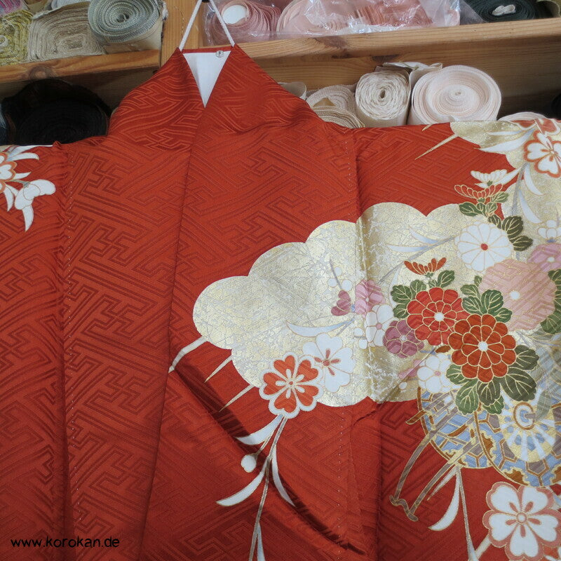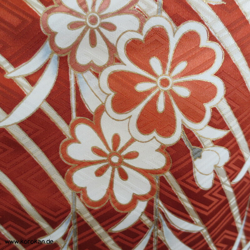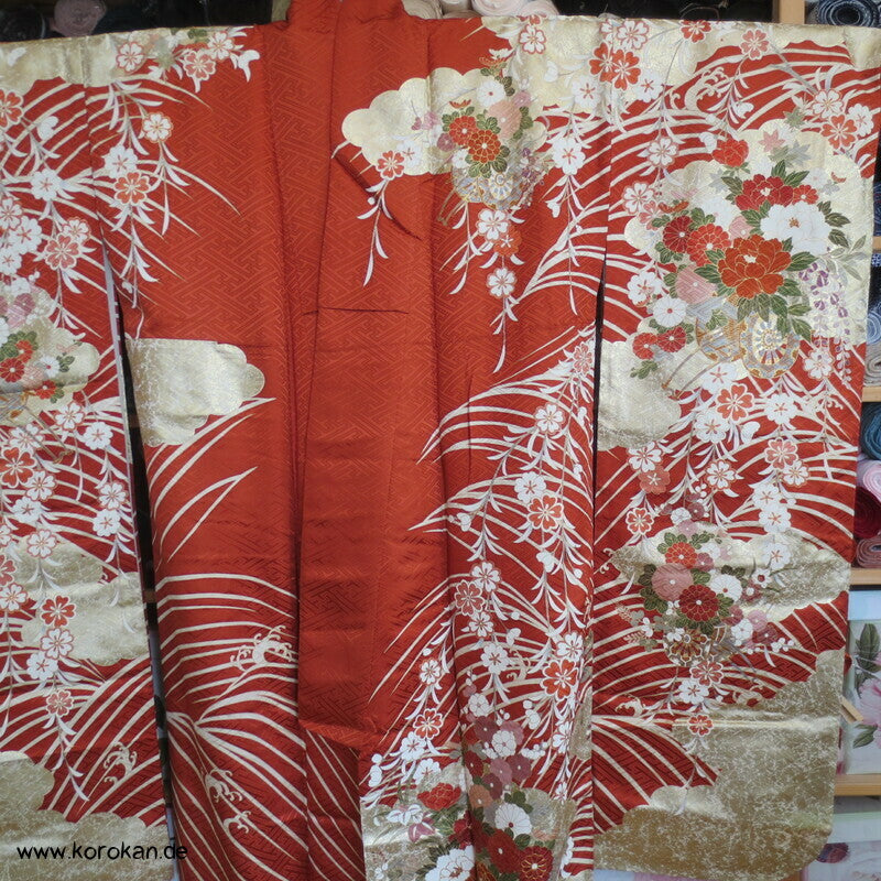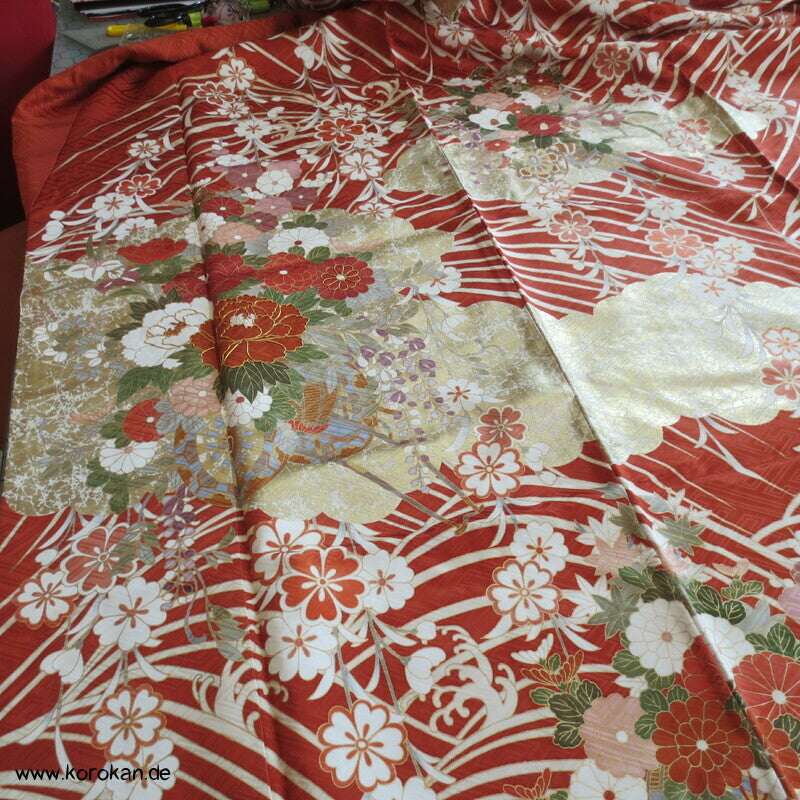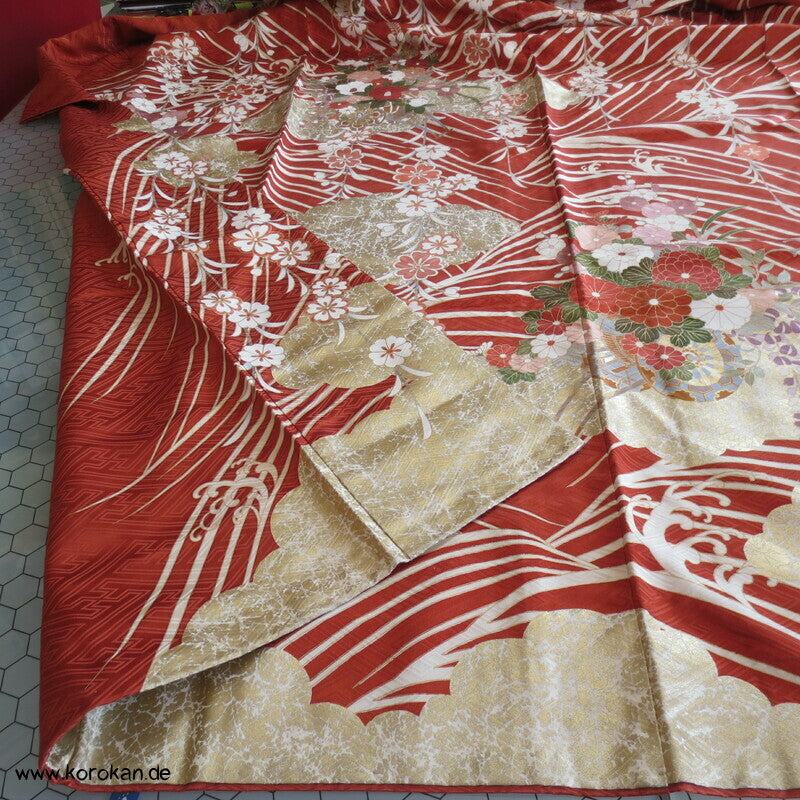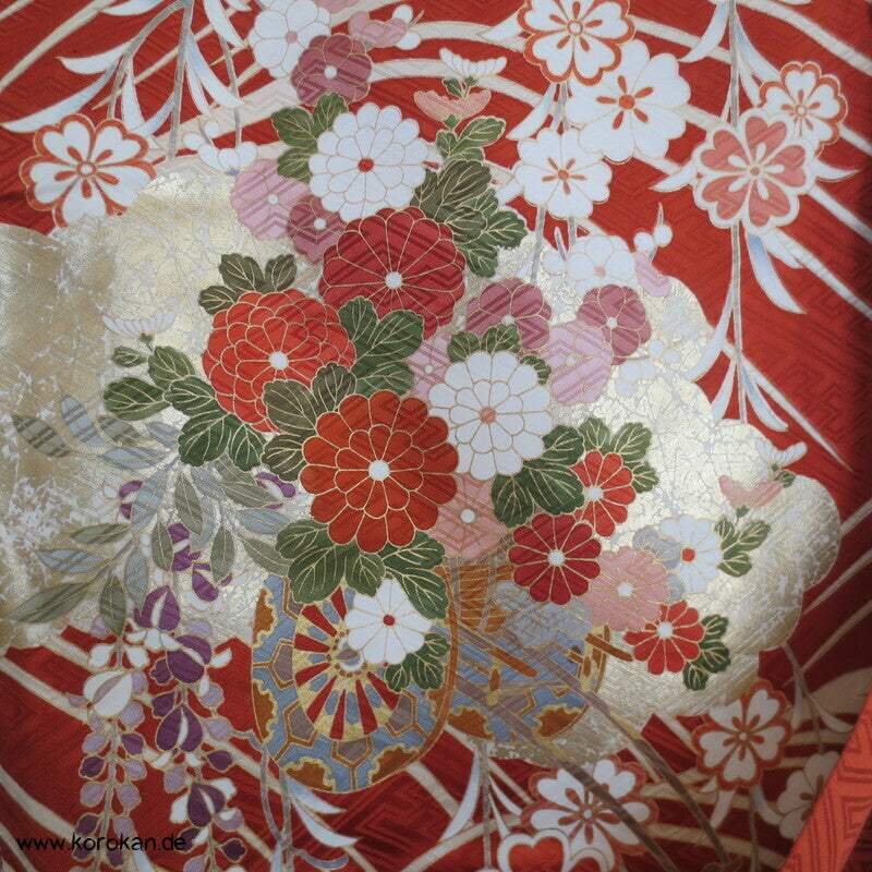 Furisode Kimono Golddruck /-stickerei Wolken, Blütenzweige auf Seidendamast