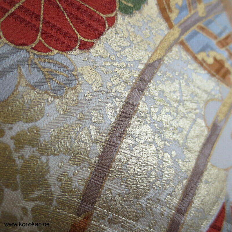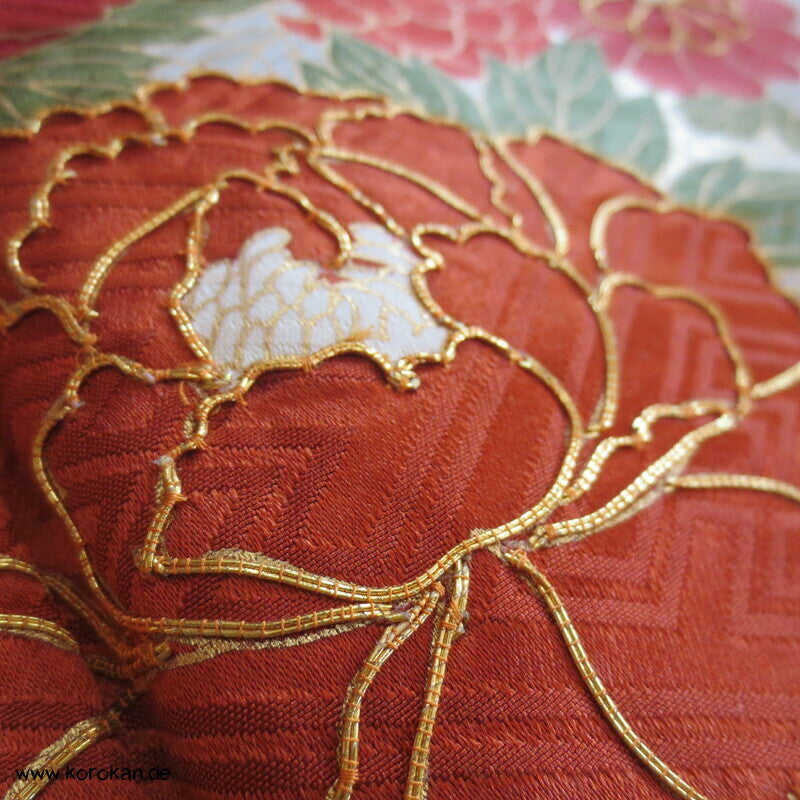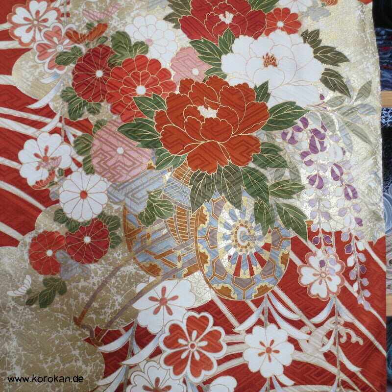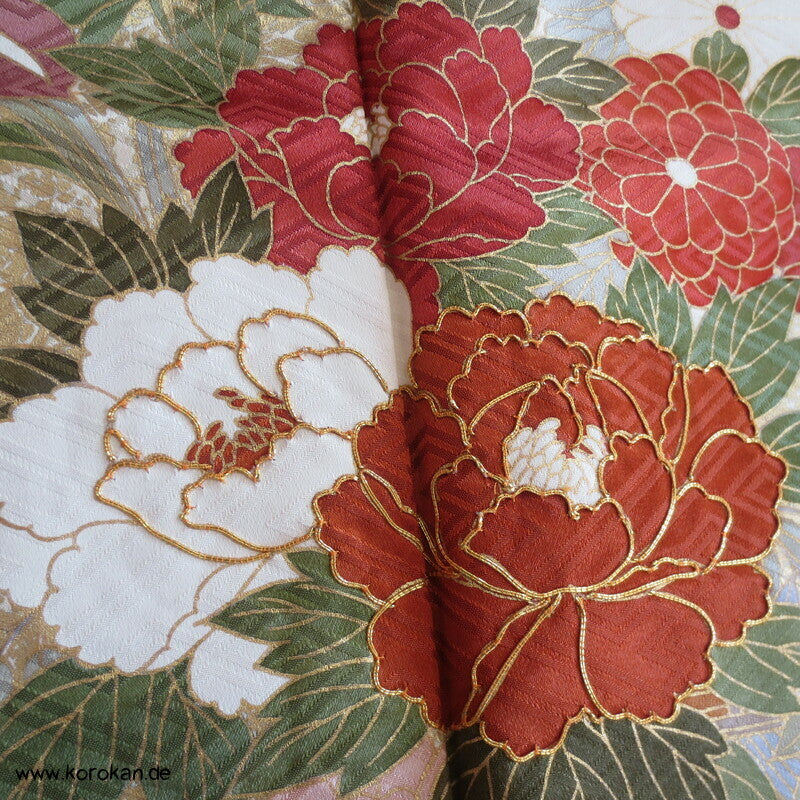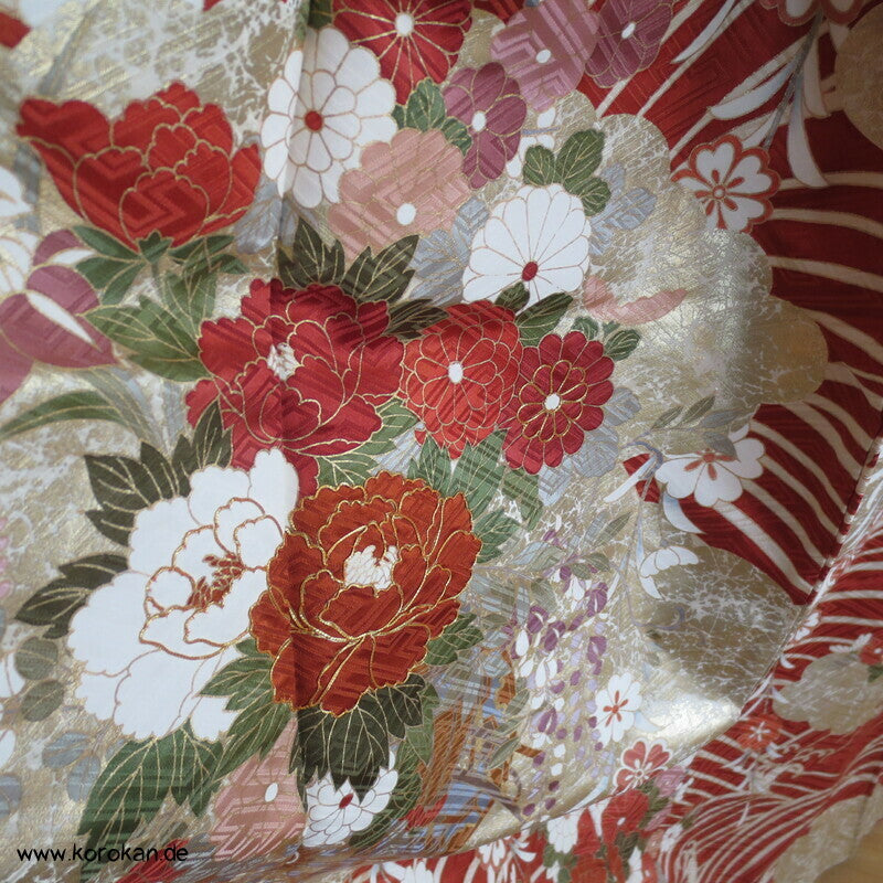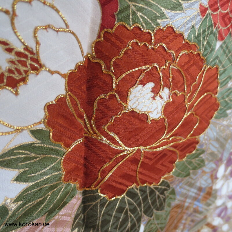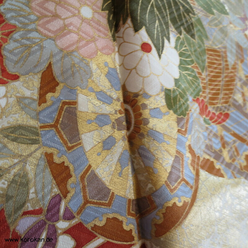 japanischer Vintage Furisode Sayagata Seidendamast mit unterschiedlichen Blumenmuster, viel Golddruck, Goldstickerei, oberes Futter helle Seide, unteres Hakkake Seidenfutter Obermaterial