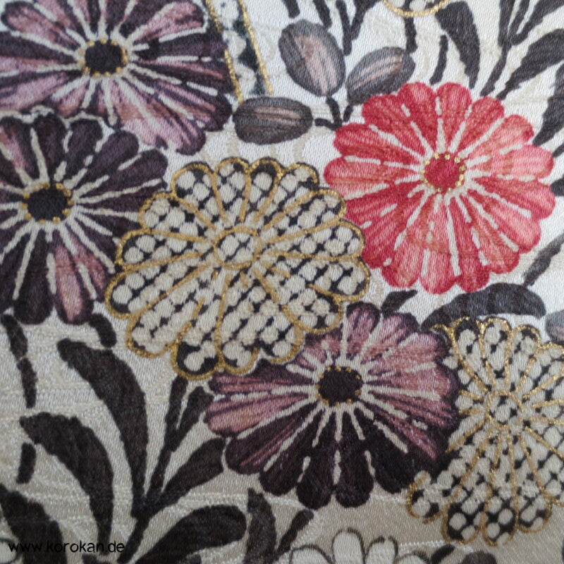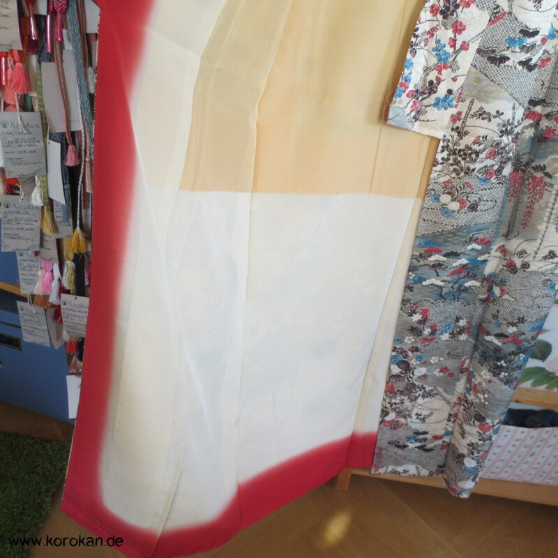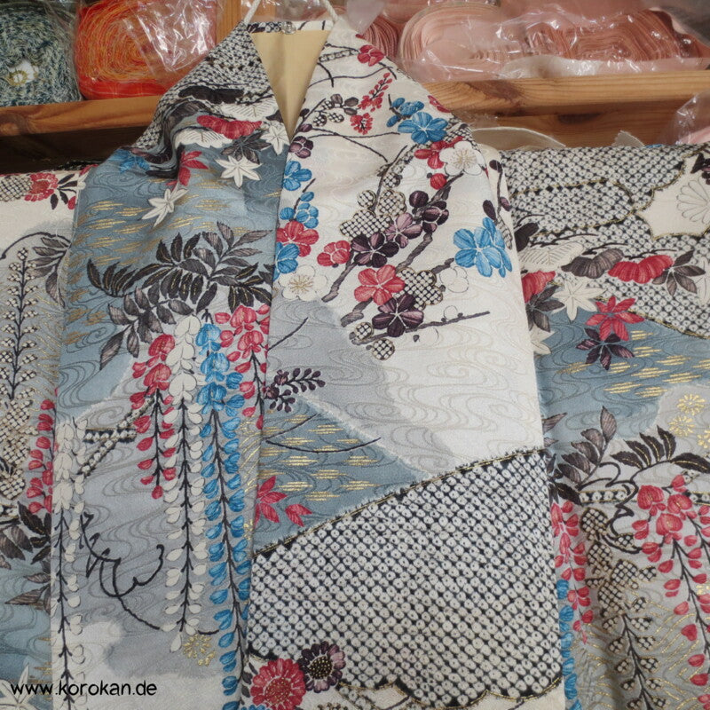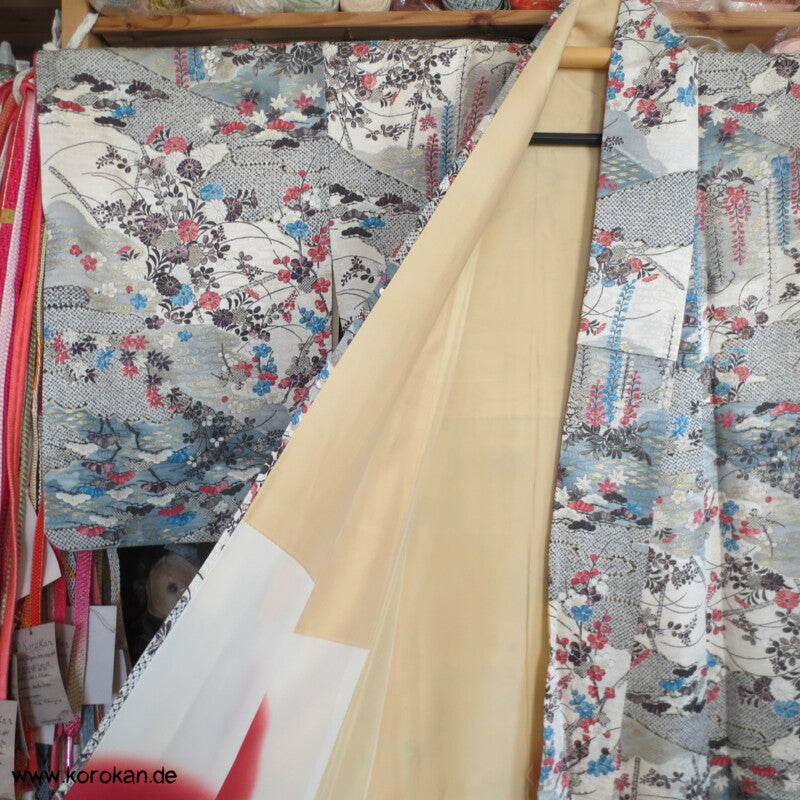 japanischer Vintage Komon Kimono Nebelwellen Seidendamast mit Wisteria und anderen Blüten auf blaugrauem Grund mit viel Golddruck, unteres Teilfutter Seidencrepe, helles Seidenfutter oben nachgedunkelt