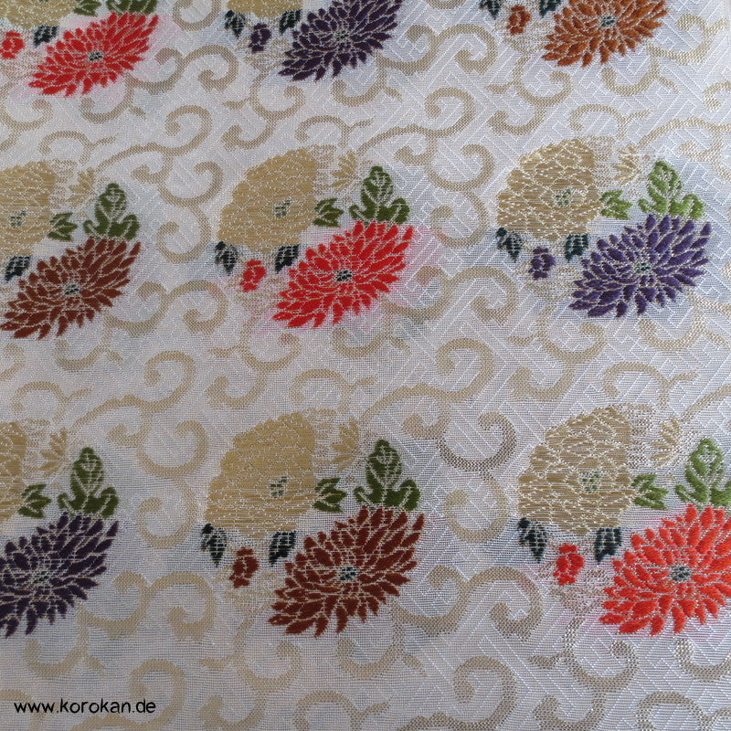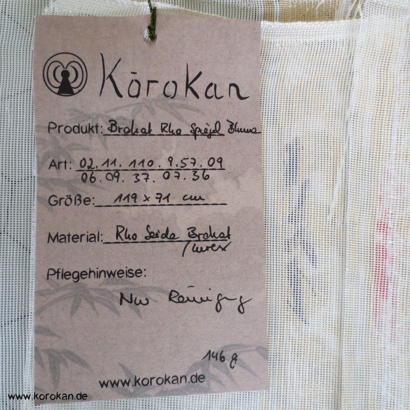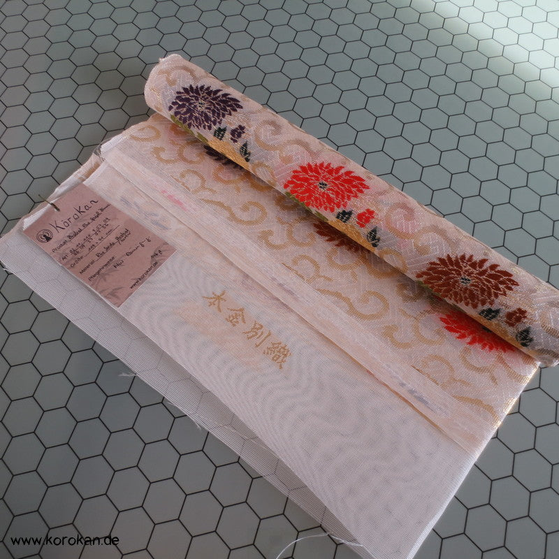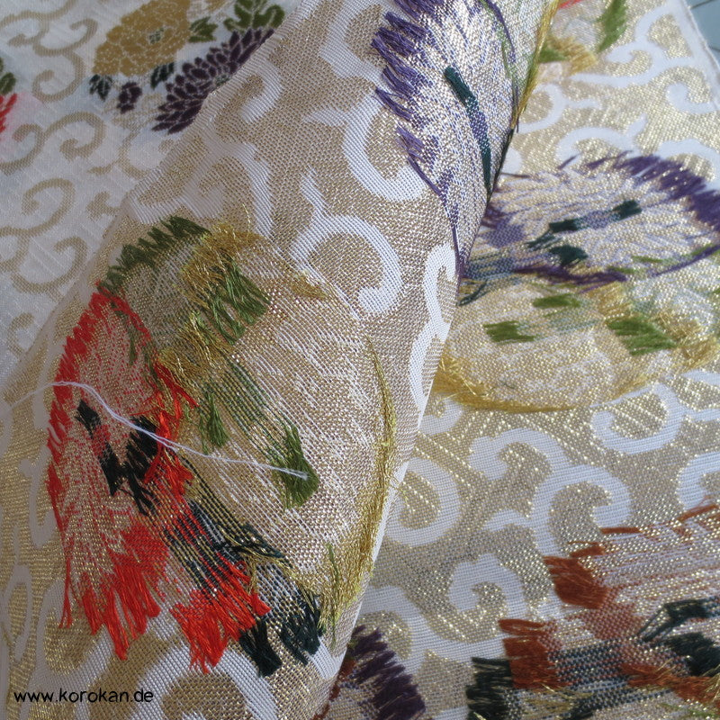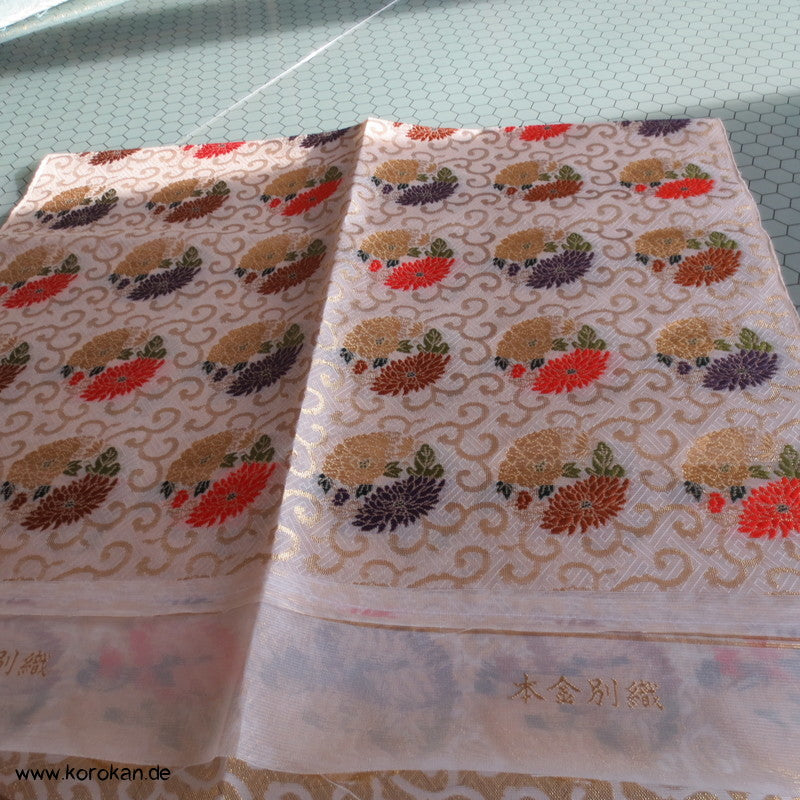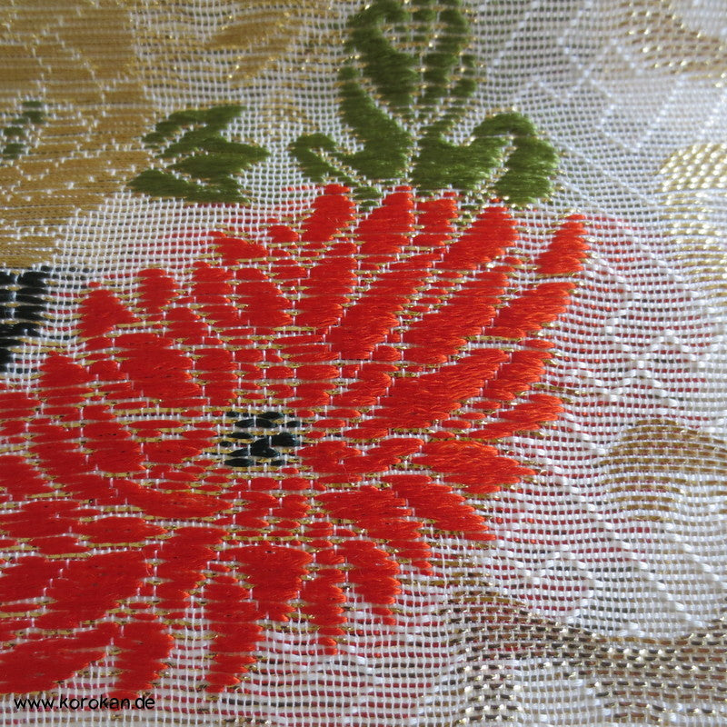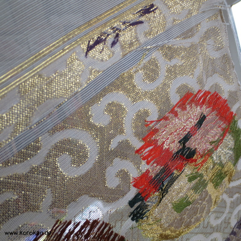 Vintage unbenutzer Seiden Brokat Rest goldene runde Blumenrondelle auf heller halbtransparenter Basis, wohl eher für Tempelzwecke als für Bekleidungszwecke gewebt