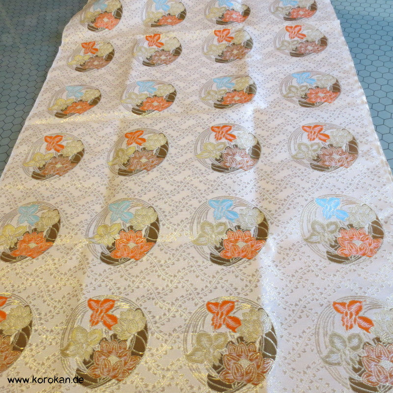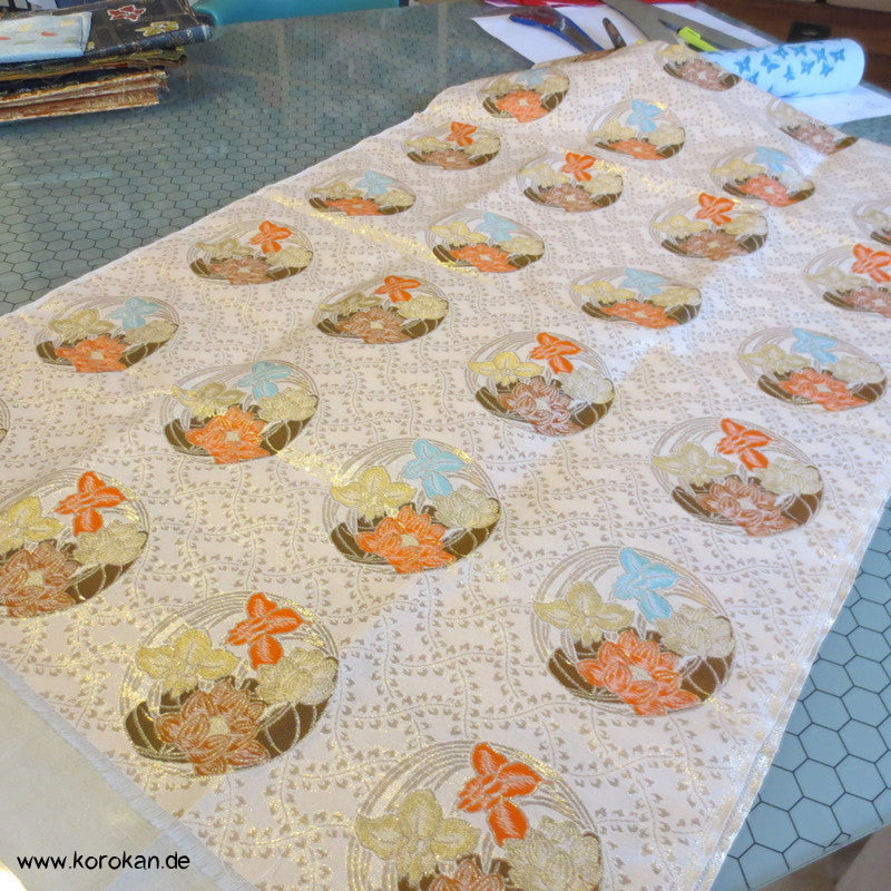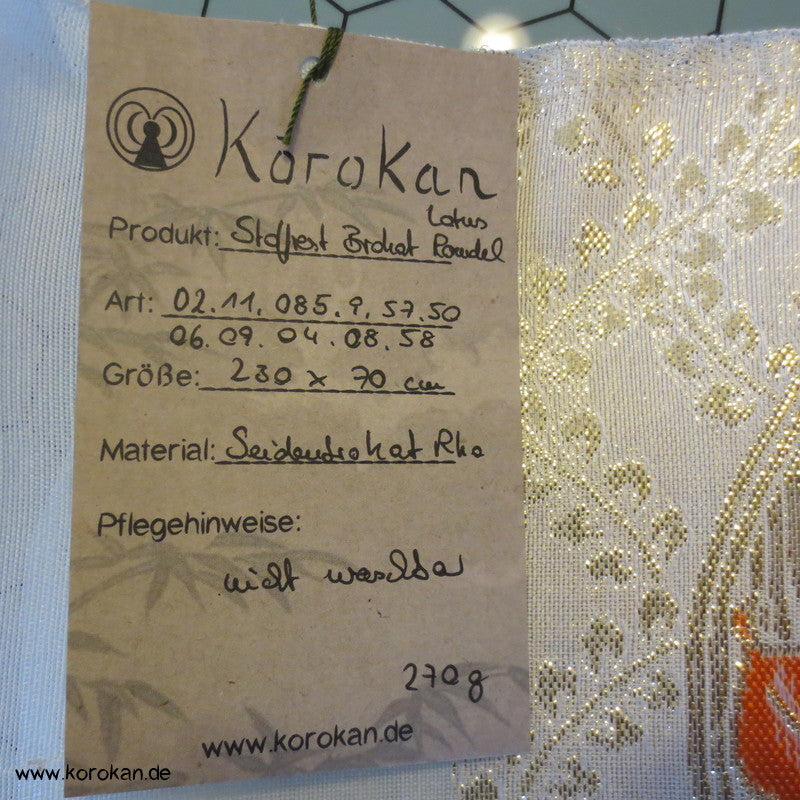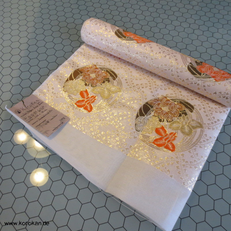 Vintage unbenutzer Seiden Brokat Rest goldene runde Blumenrondelle auf heller halbtransparenter Basis, wohl eher für Tempelzwecke als für Bekleidungszwecke gewebt