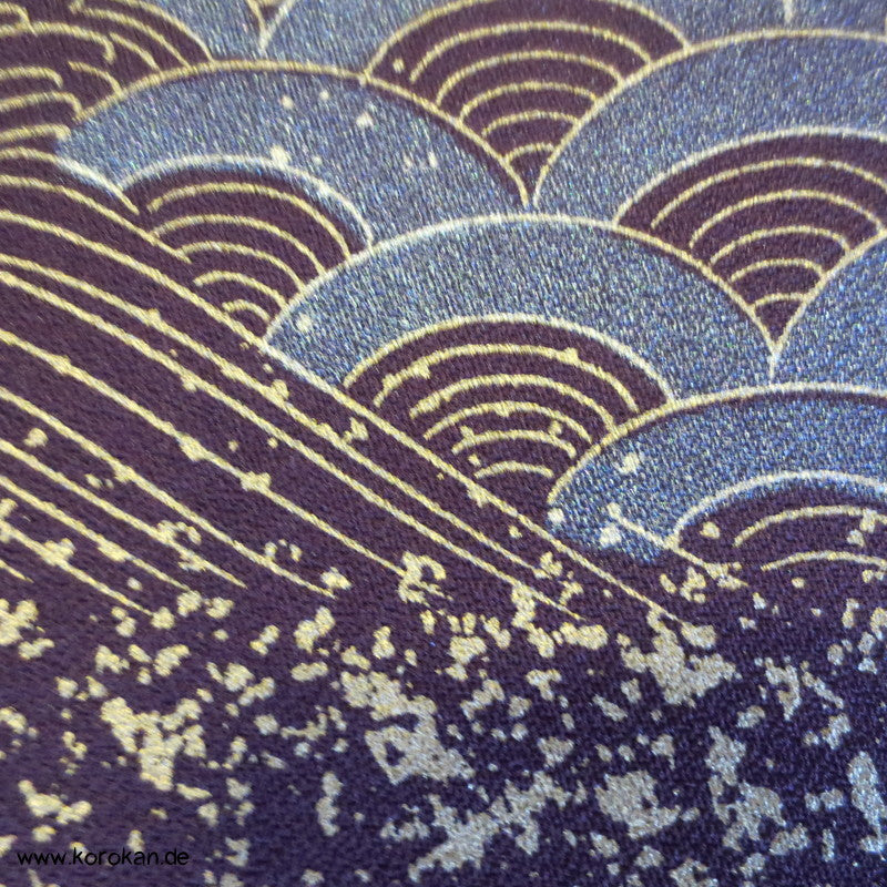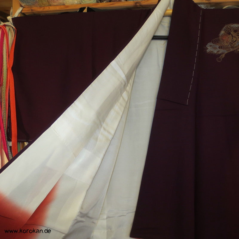 japanischer Vintage Homongi Kimono dicker Seidencrepesatin goldene Wellen und Motive auf aubergine, oberem hellen Seiden Futter und unterem Hakkake Futter Seidencrepe Bokashi Verlaufsrand in rot