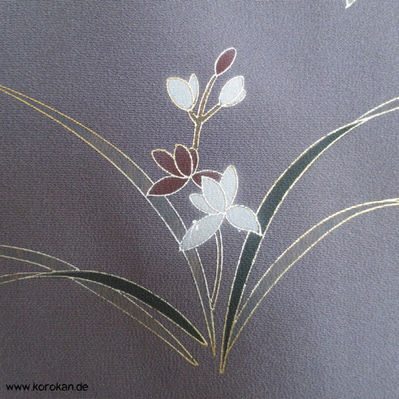 Vintage japanischer Homongi Kimono dunkelgrauer Seidencrepe, bemalt mit goldenen Blätter und Blumenmotiven, feinem oberen hellen Seidenfutter und unterem Hakkake Seidenfutter grau.