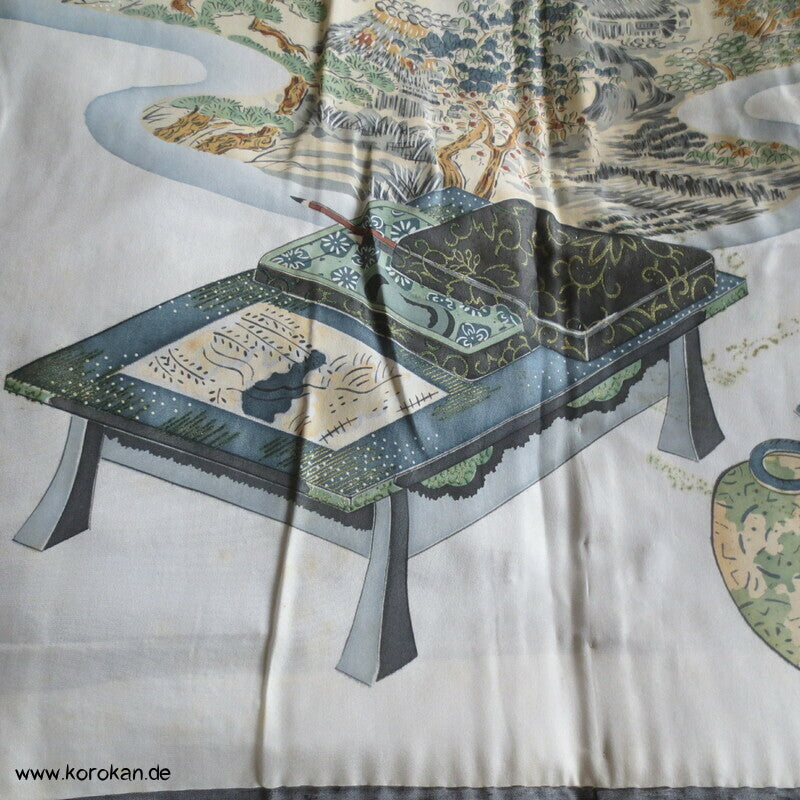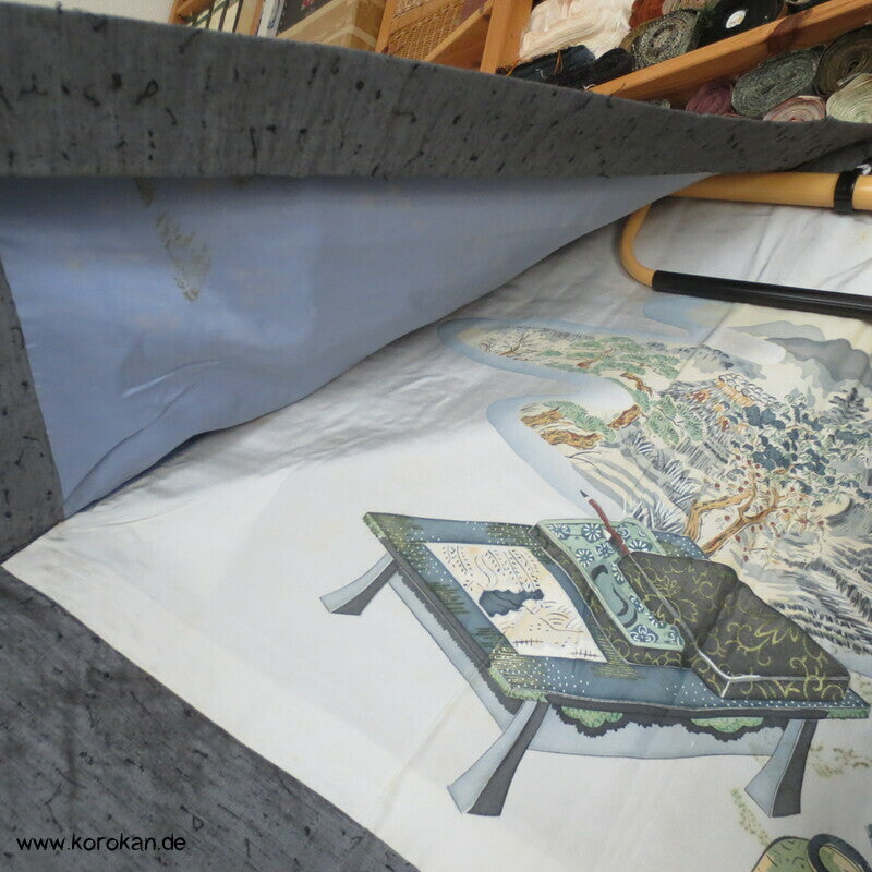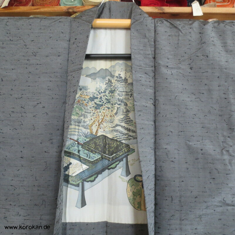 Vintage japanische Männer Haori aus grau - anthrazit grob gewebter Fushi Tsumugi Seide mit Seidenfutter handgemalt Schreib / Malset Tisch vor einem Landschaftsbild.