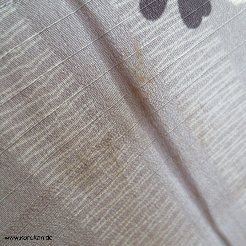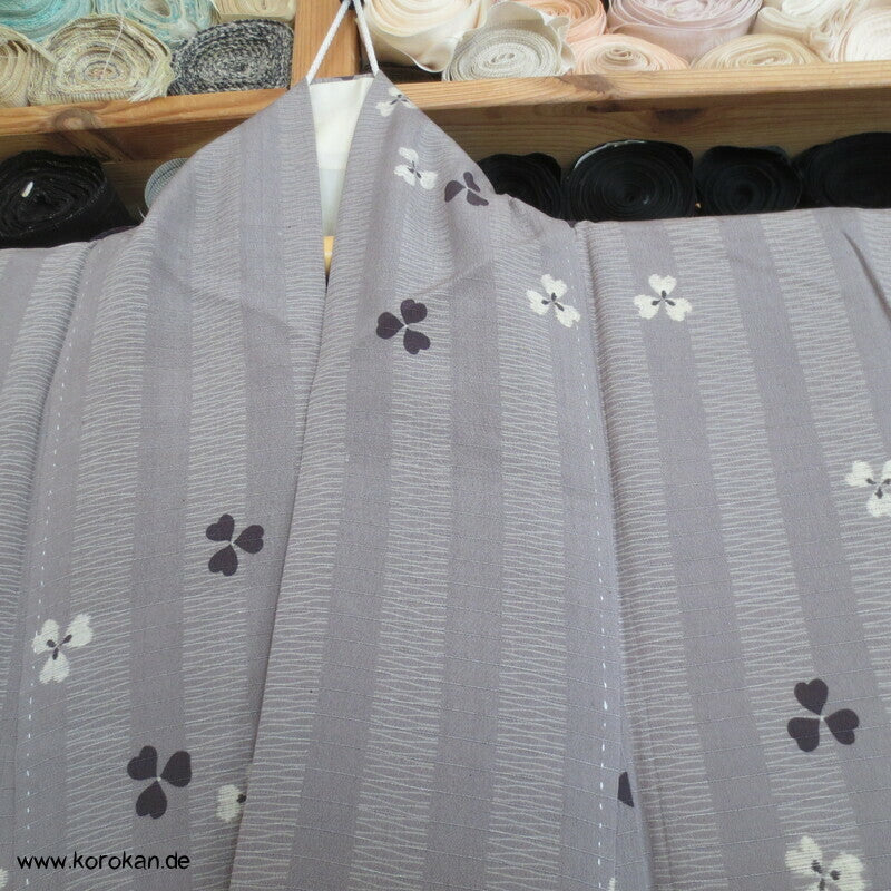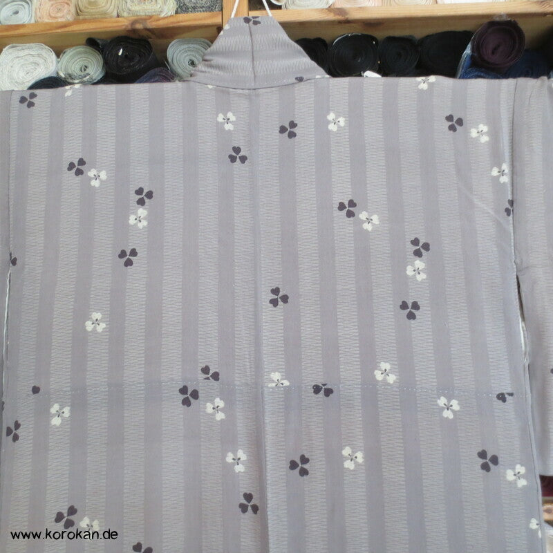 Vintage, eher antiker Komon Kimono Streifen mit Kleeblättern Chirimen Seidencrepe, oberem hellen Seiden Futter und unterem Hakkake Futter Seidencrepe hellmauve