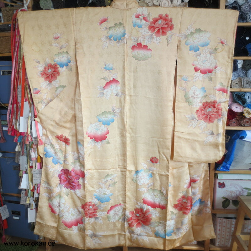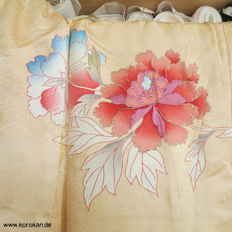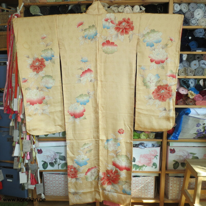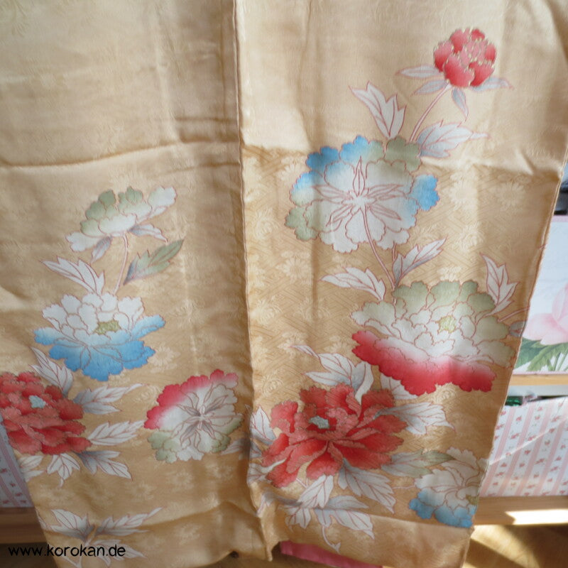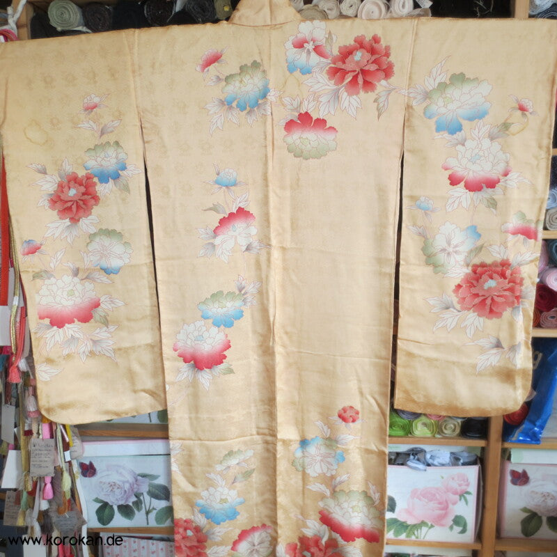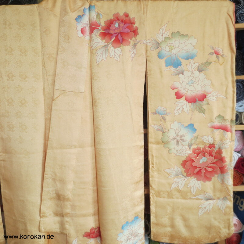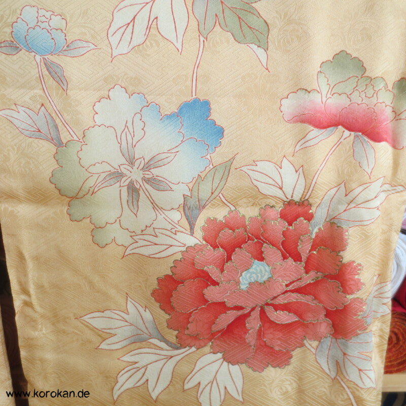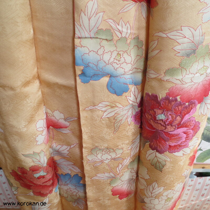 japanischer Vintage Furisode Sayagata Seidendamast Kimono gestickte Päonien auf goldgelbem Grund, teilbestickt mit viel Goldauflage und Goldfäden