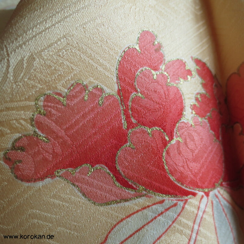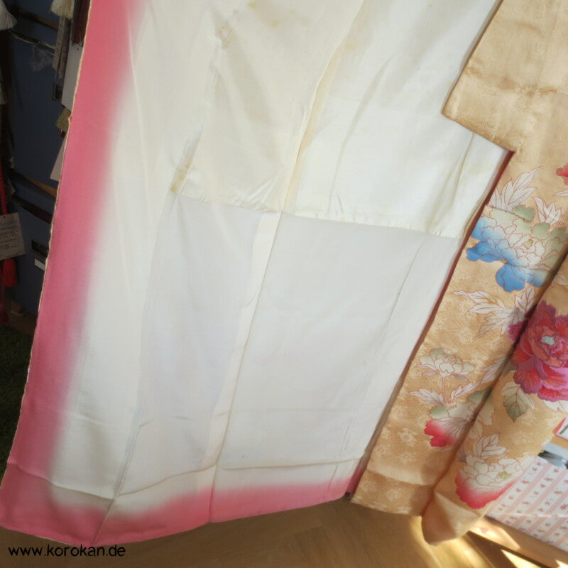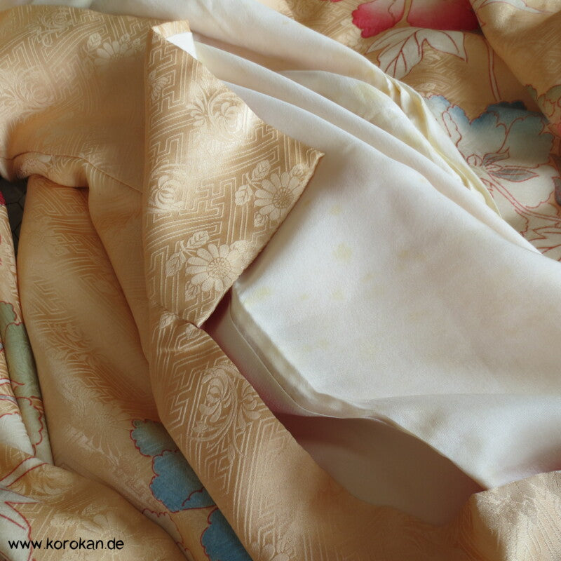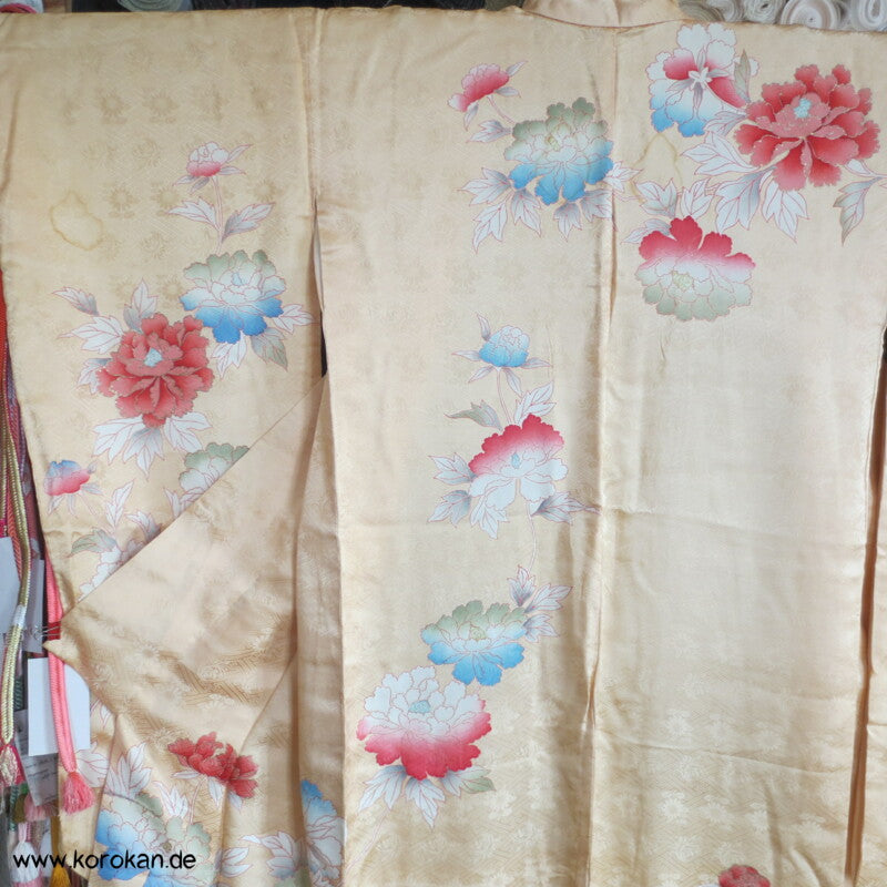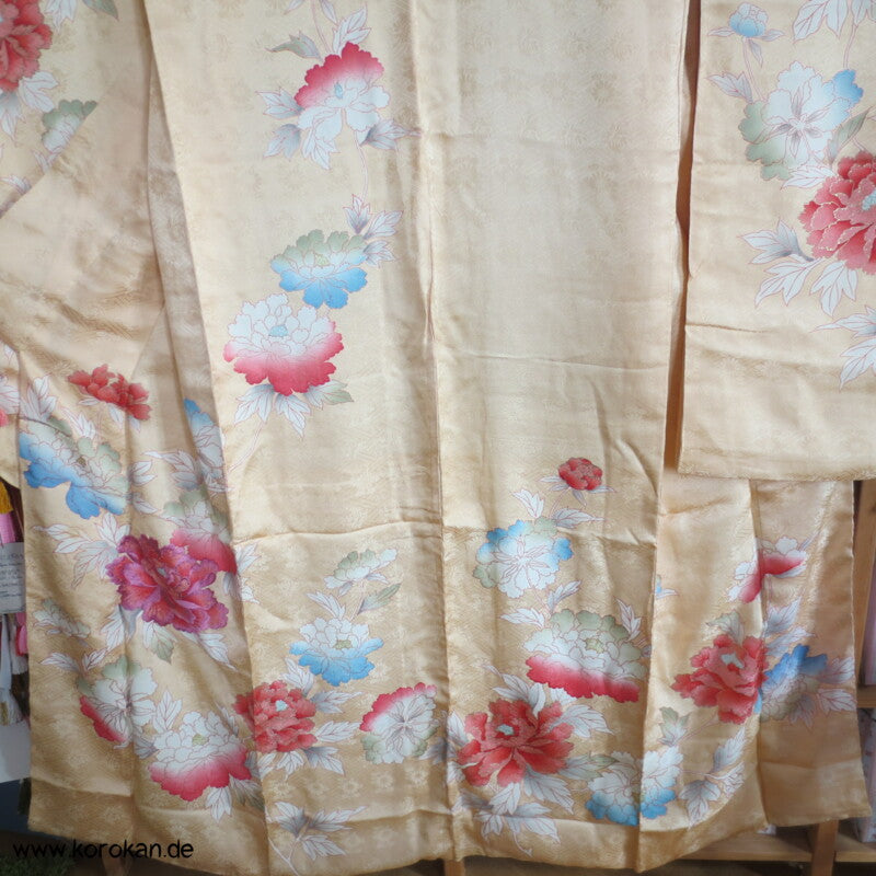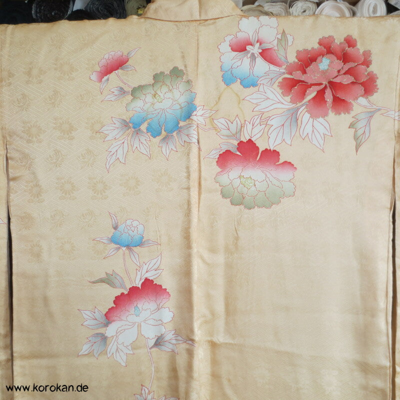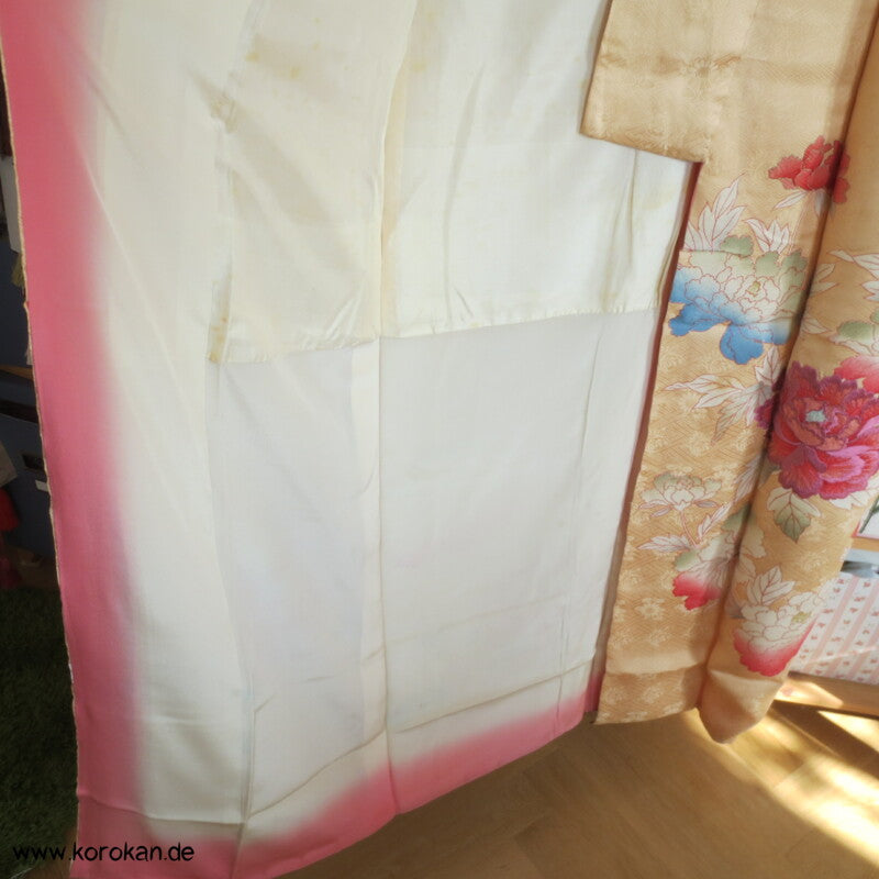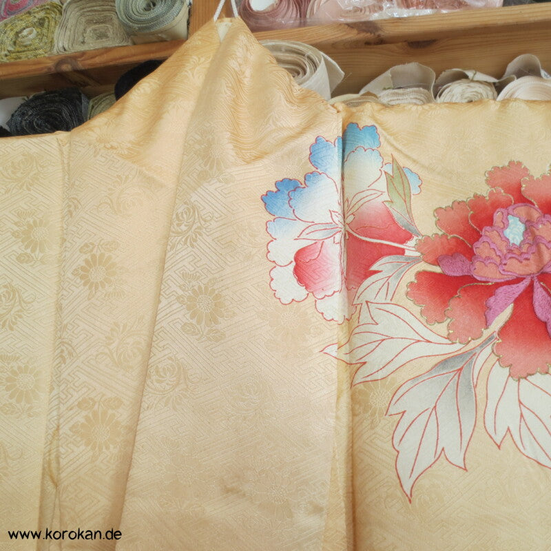 japanischer Vintage Furisode Sayagata Seidendamast Kimono gestickte Päonien auf goldgelbem Grund, teilbestickt mit viel Goldauflage und Goldfäden