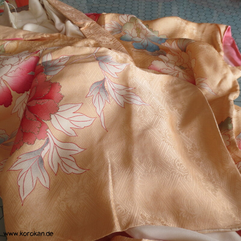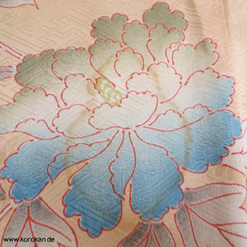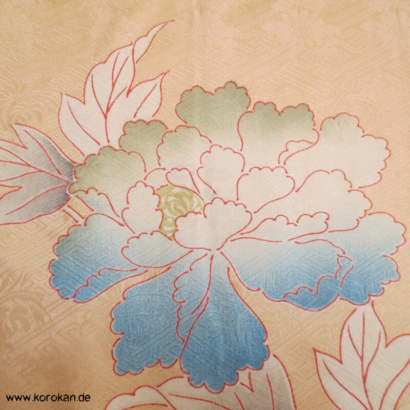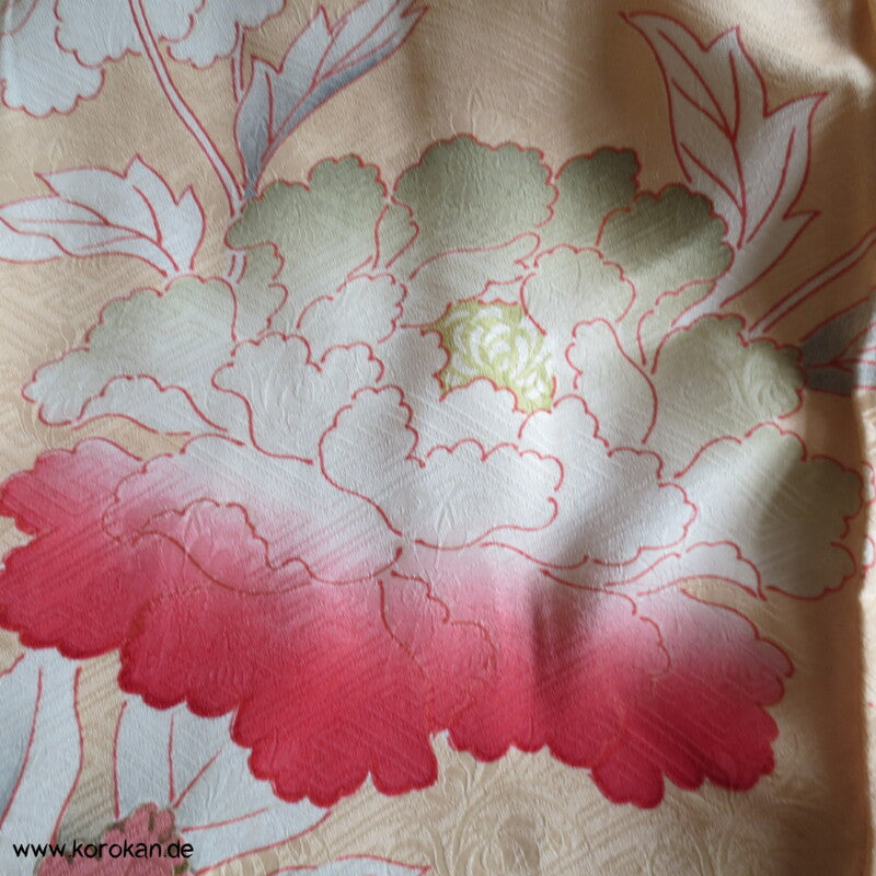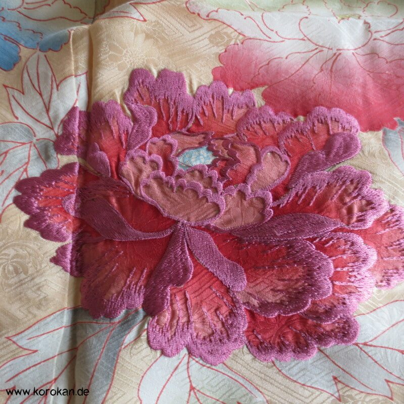 große Päonien, teilbestickter Furisode Seidendamast Kimono