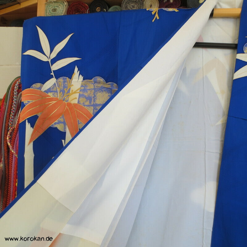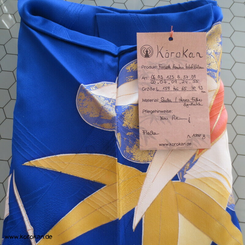 Vintage Furisode Seidendamast Kimono großer Bambus auf kobaltblauem Grund, teilbestickt mit viel Goldauflage und Goldfäden