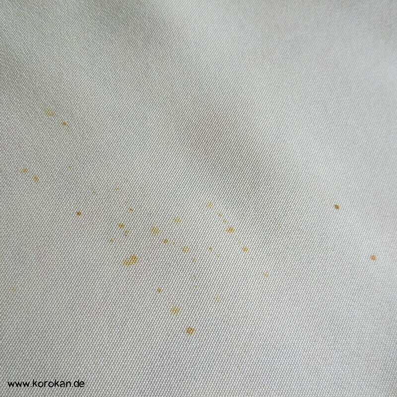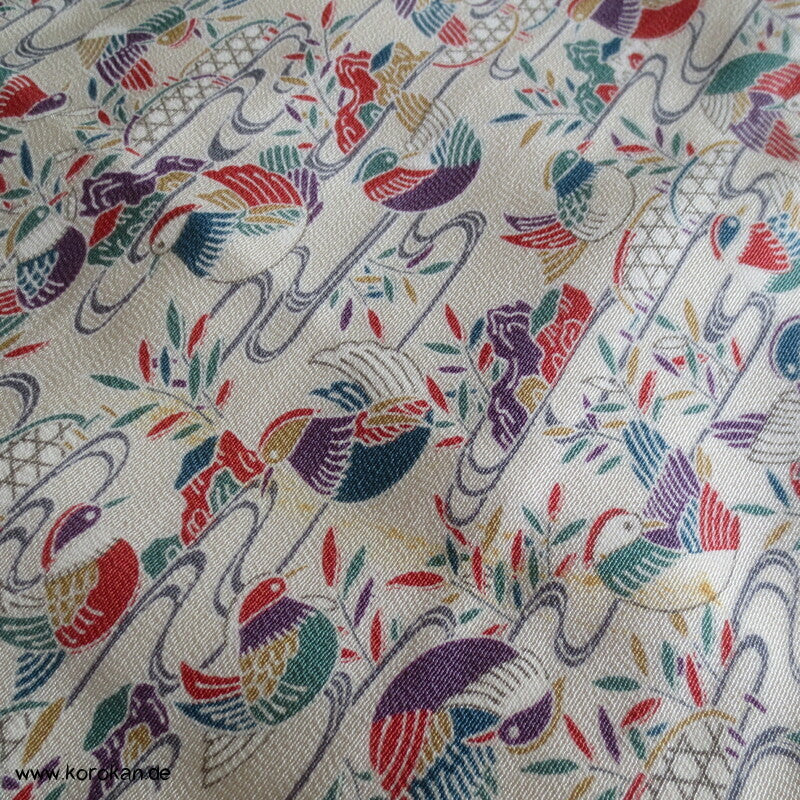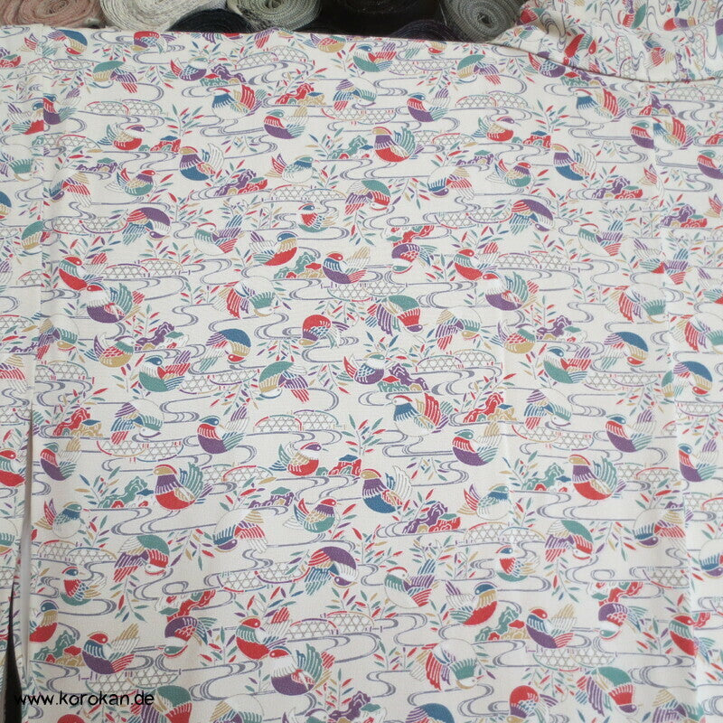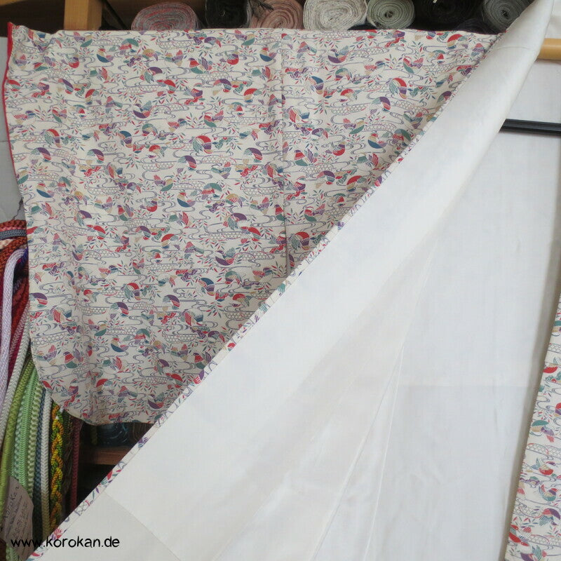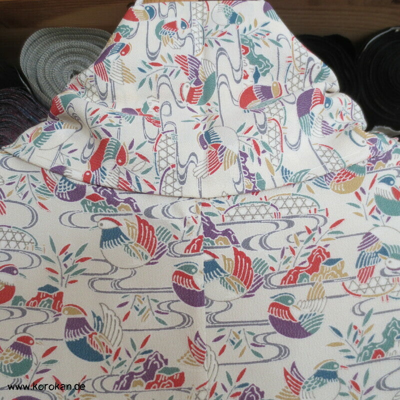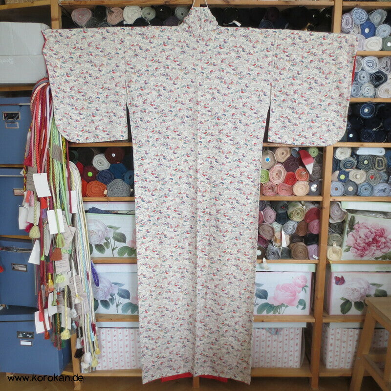 Vintage Kimono Komon lauter kleine Mandarinenten auf hellem Chirimen Seidencrepe, oberen hellen Seiden Futter und unterem Hakkake Futter Seidencrepe mit Bokashi Farbverlaufsrand in rotrosa