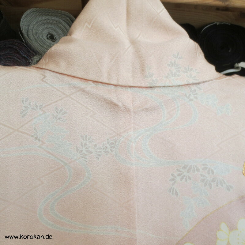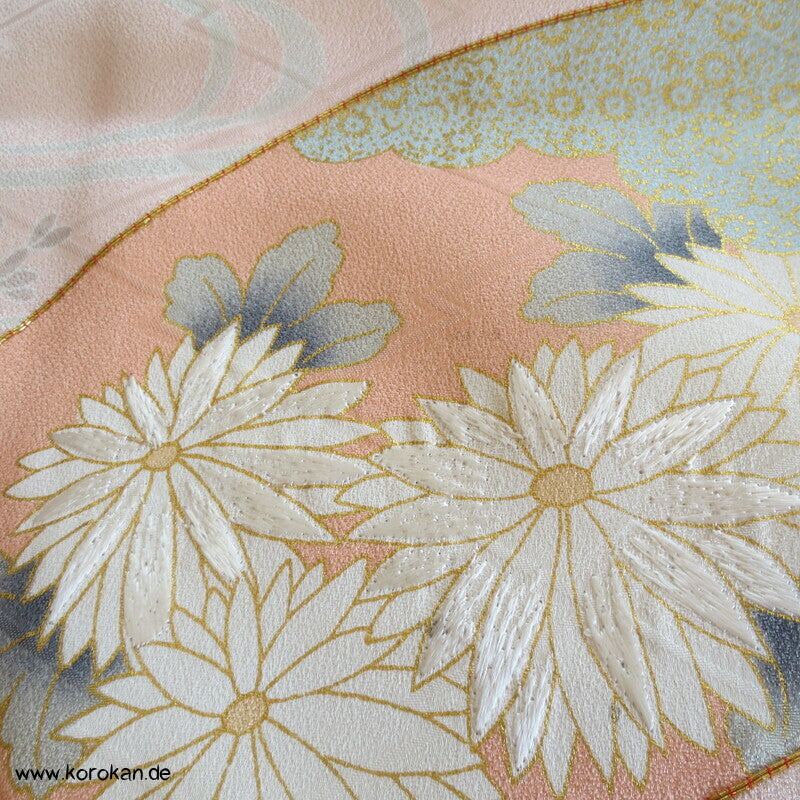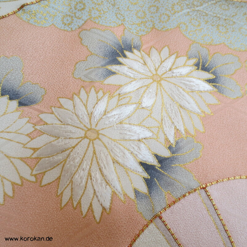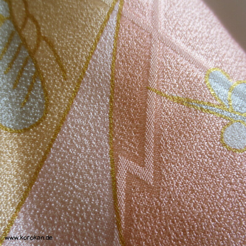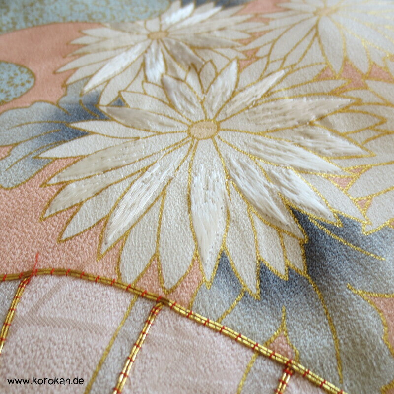 Vintage Furisode Matzukawabishi Zacken Seidendamast Kimono Fächern mit Blüten teilbestickt, mit Goldrändern und goldbestickt.