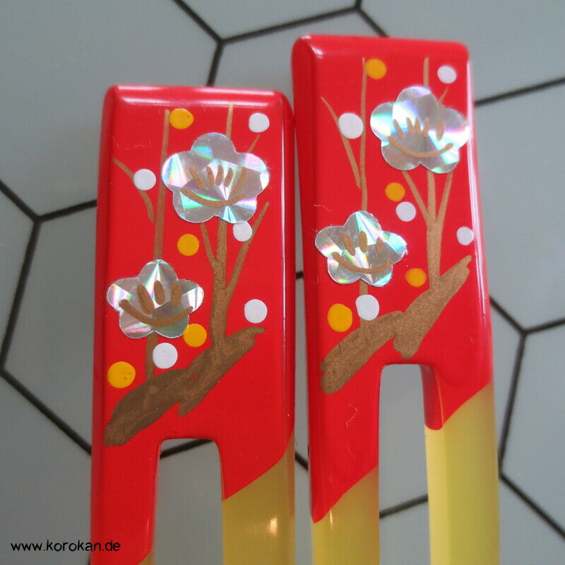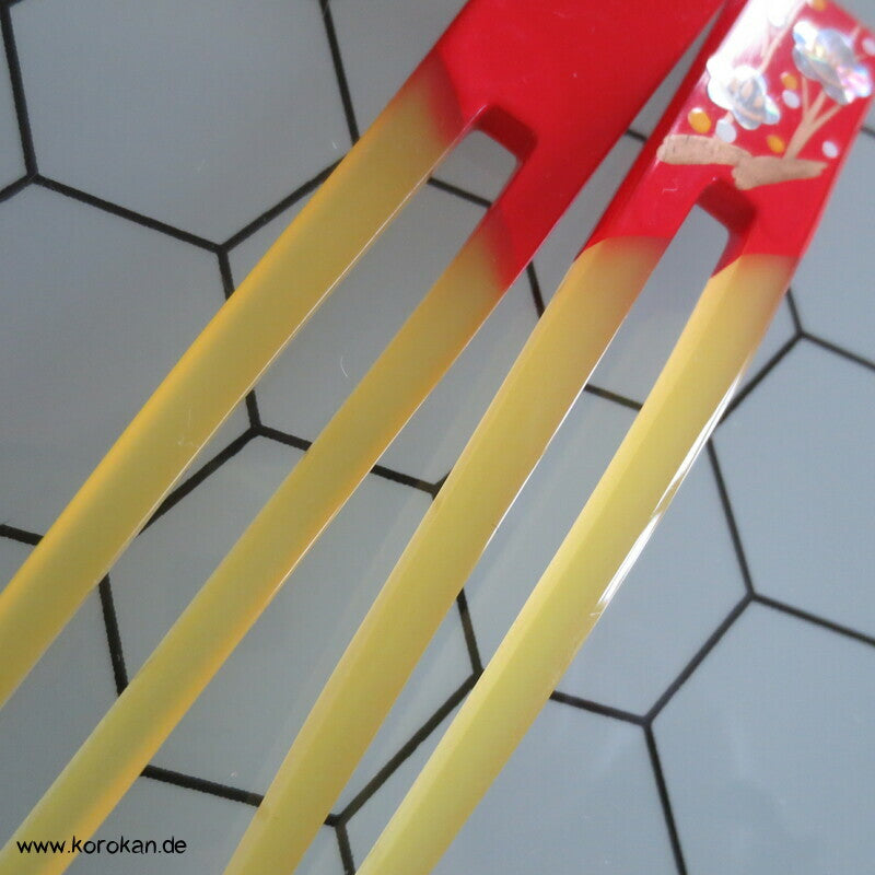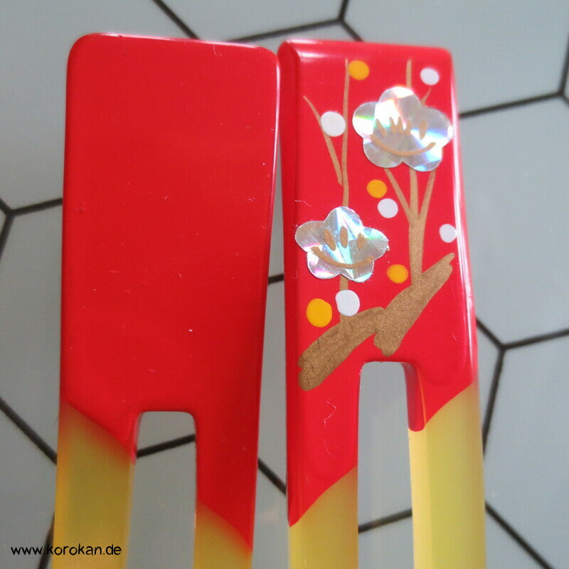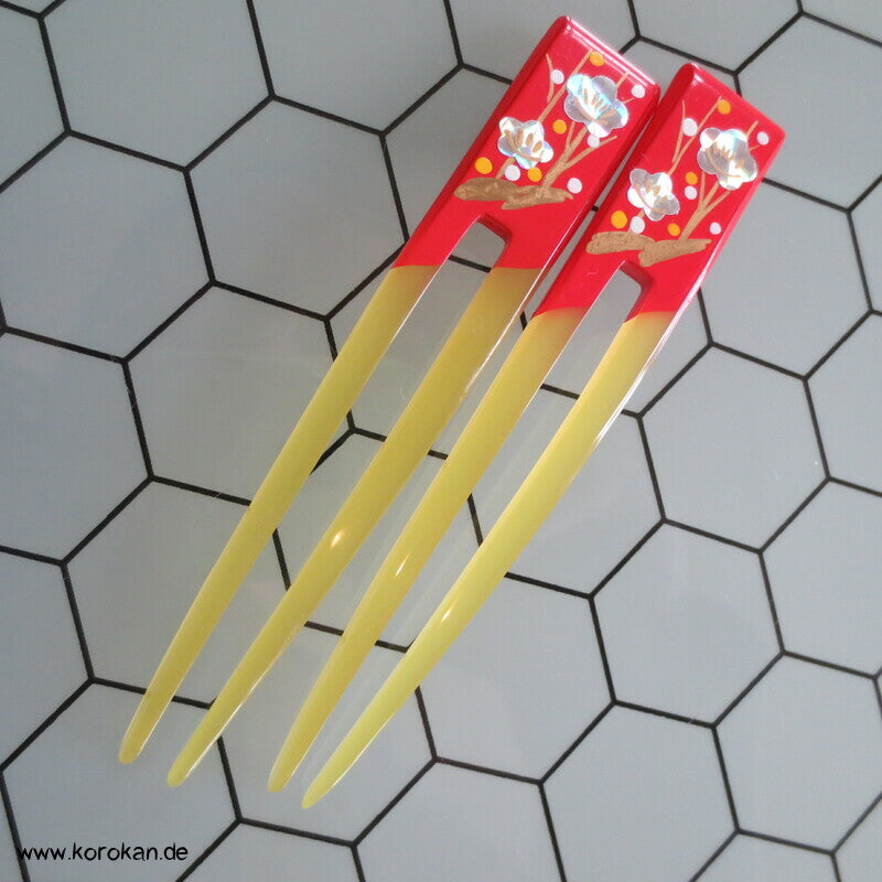 Vintage Haarnadel helles Harz mit rotem Lack und Perlmuttblüten für japanische Haartrachten.