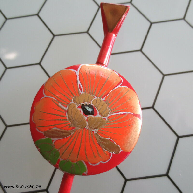Vintage handbemalter Holz Haarstab eine Seite eine Päonie, die andere Bambus, für japanische Haartrachten.