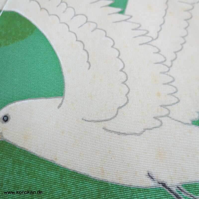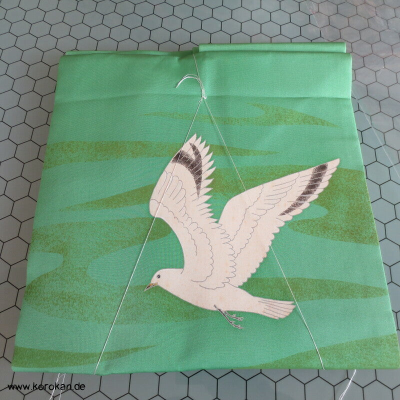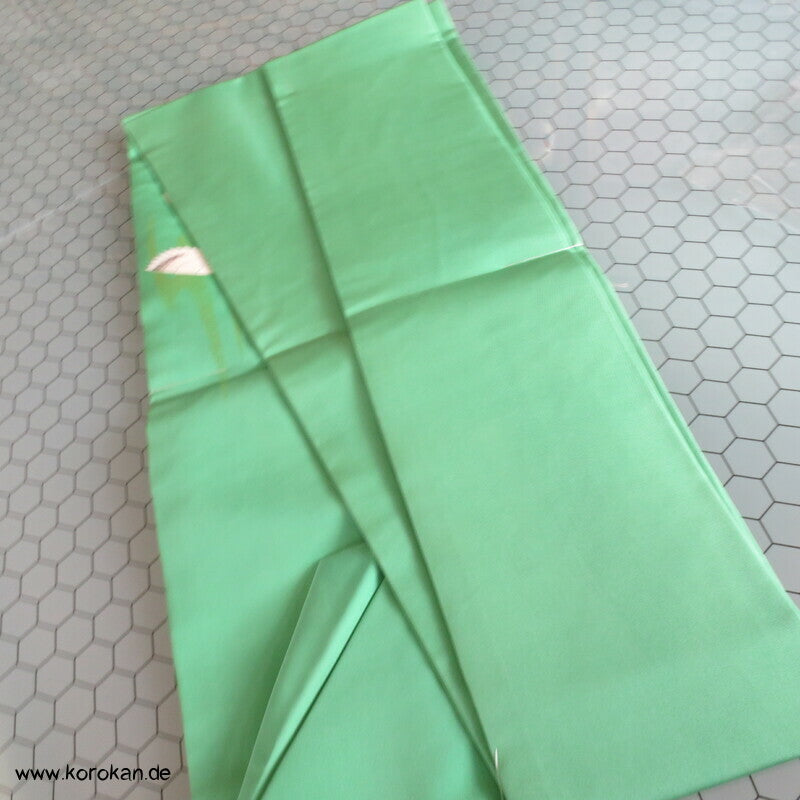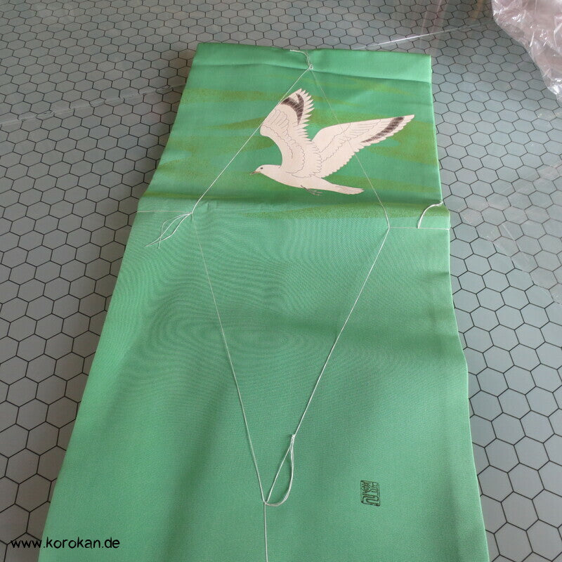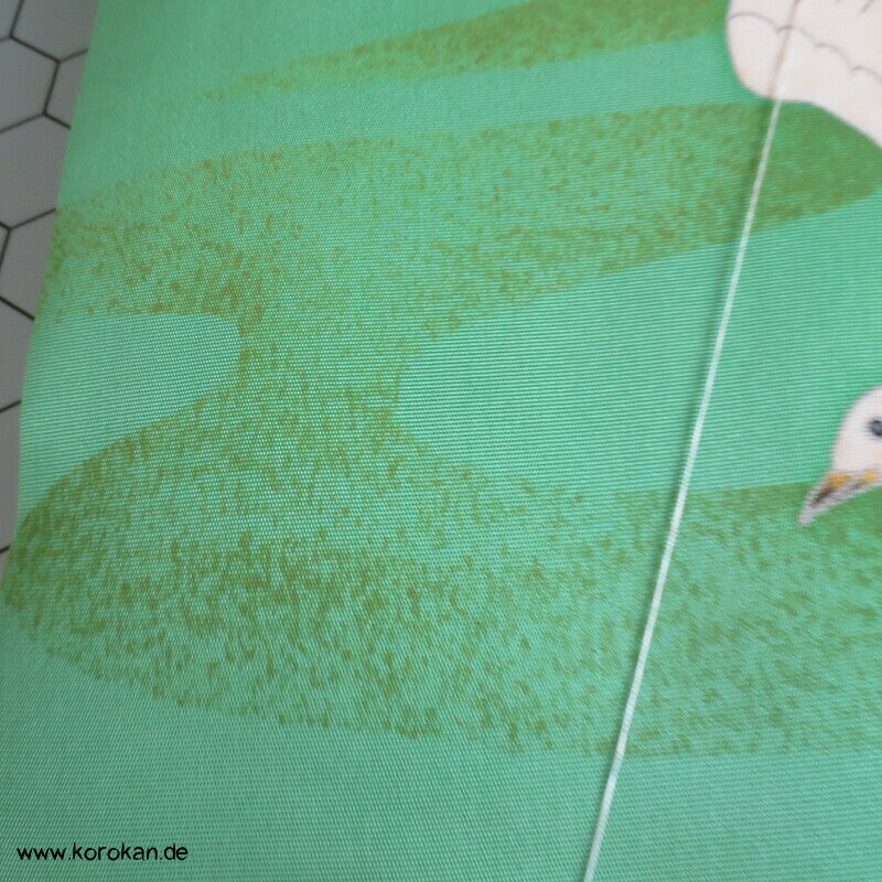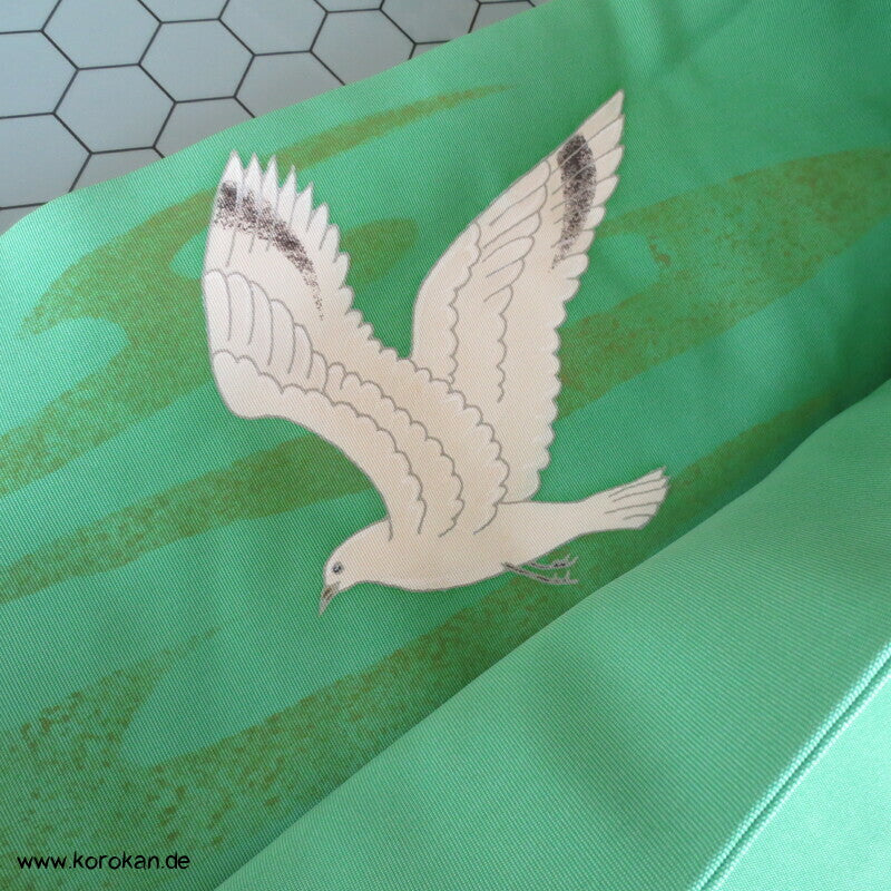 Vintage unbenutzter originalgehefteter Nagoya Obi, Seidenrips in grün mit grünen Wellen auf denen eine große und eine kleine handgemalte Möwe fliegen - die Möven sind etwas liegefleckig, kann man aber auch als Federkleid interpretieren.