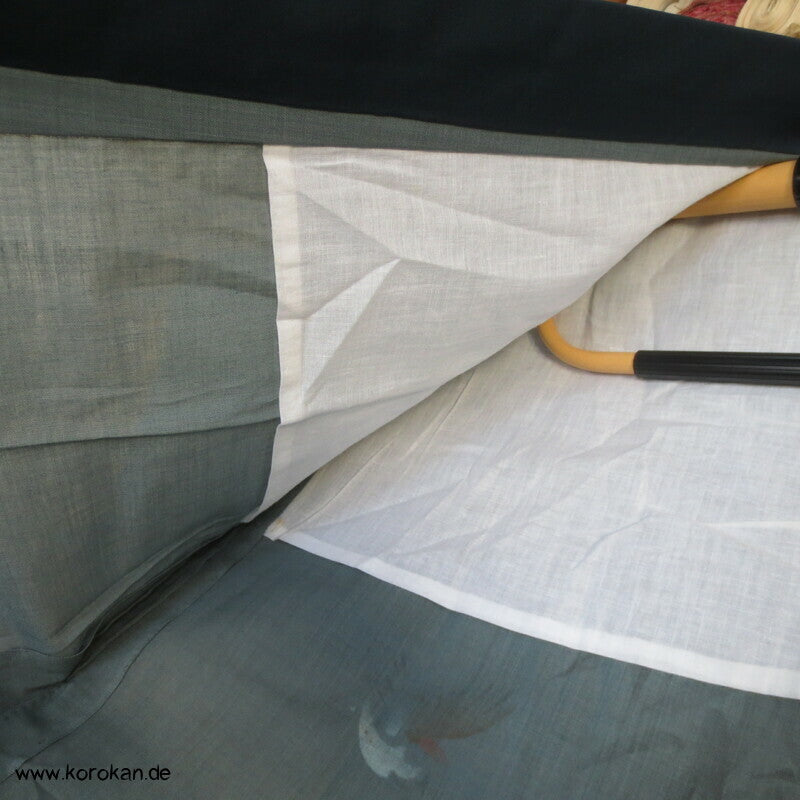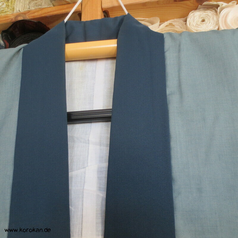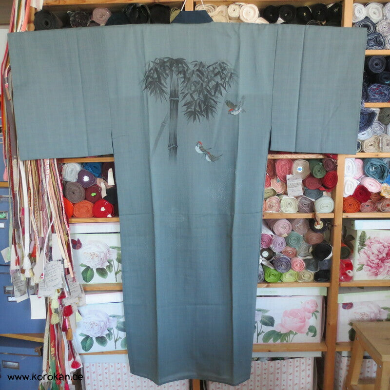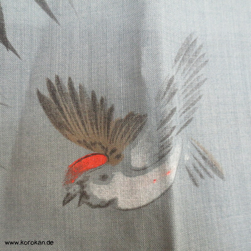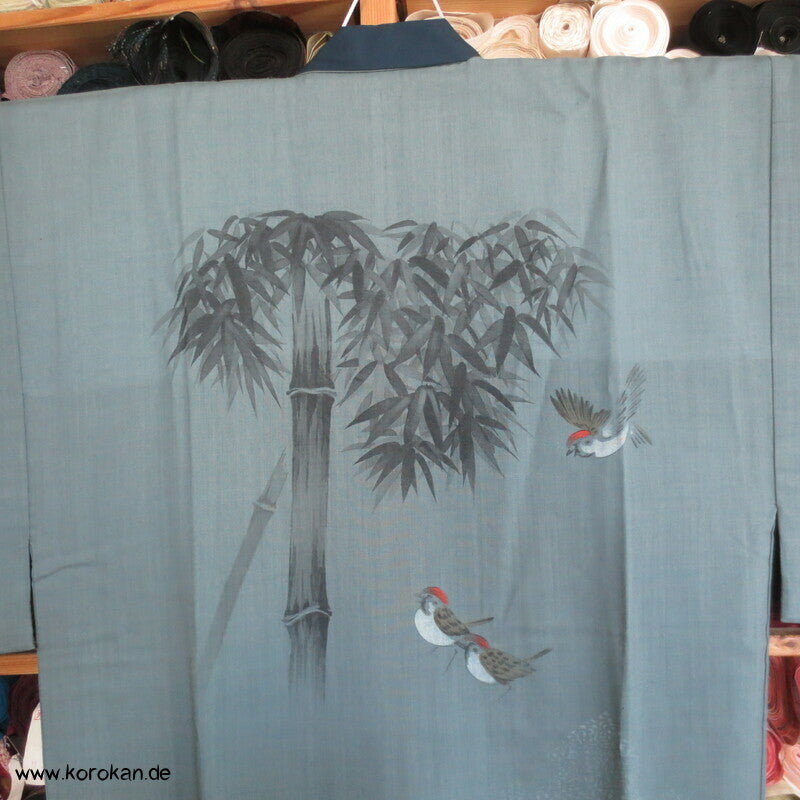 Vintage Männer Juban Unterkimono aus feinem weichen Woll Musselin bemalt mit zwei Spatzen im Bambus, wobei diese Spatzen rote Kappen haben... eventuell ein japanischer Vogel, blauer Seiden Rips Kragen