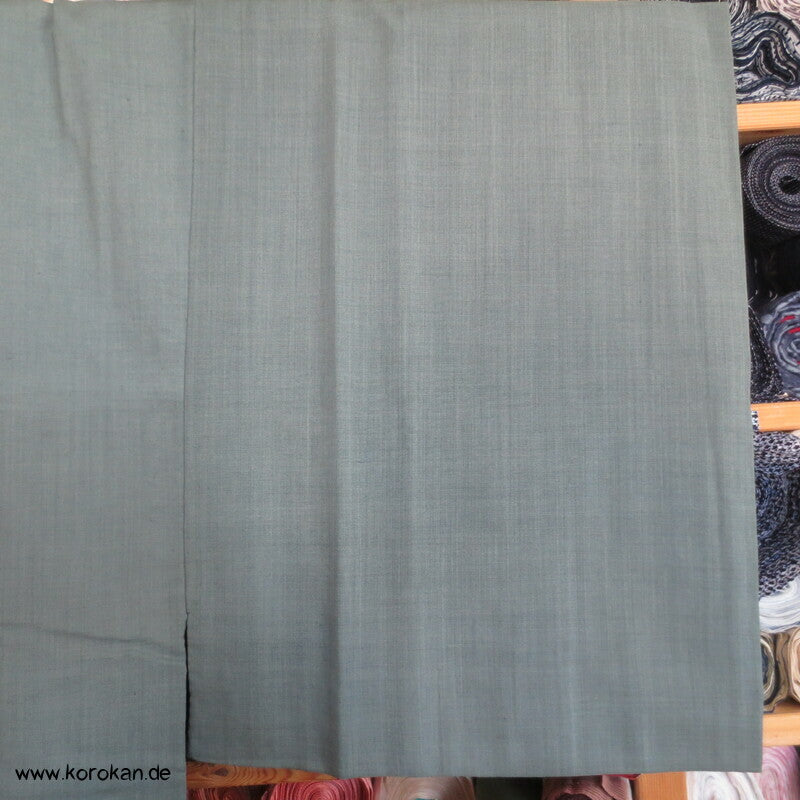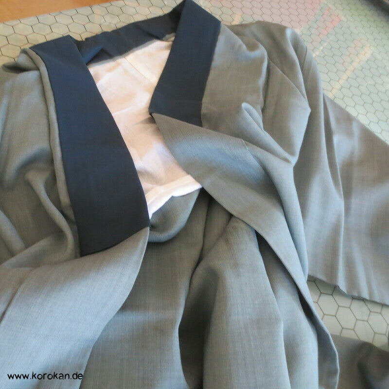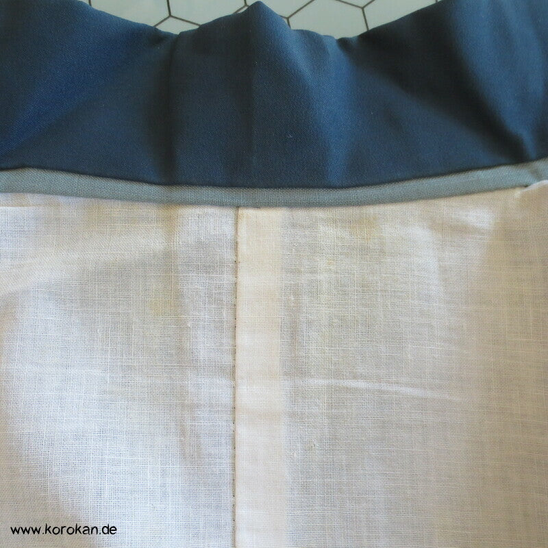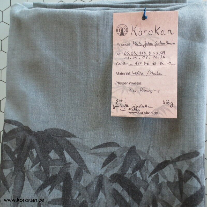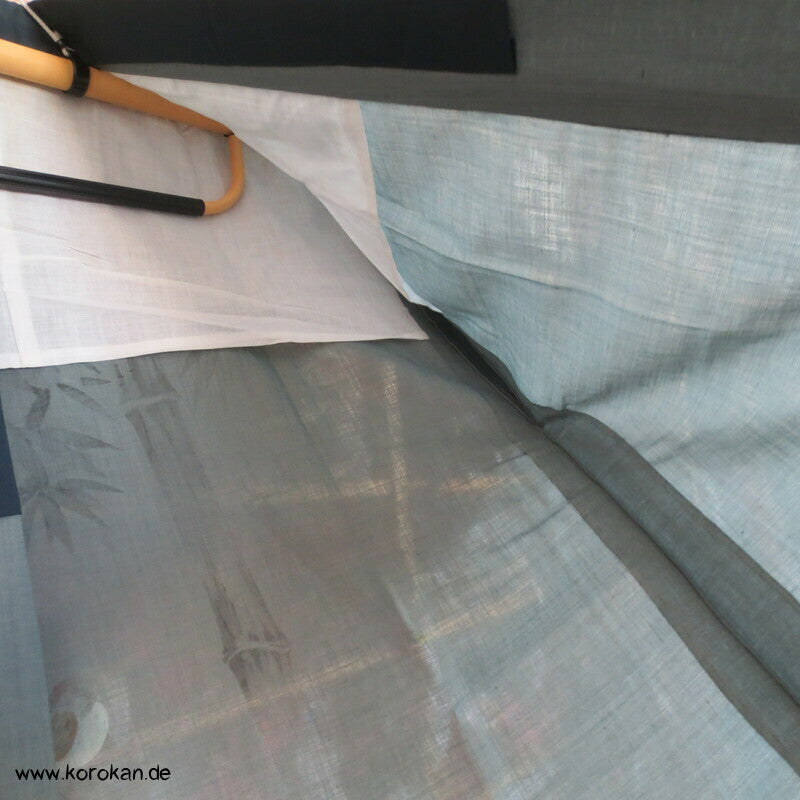 Vintage Männer Juban Unterkimono aus feinem weichen Woll Musselin bemalt mit zwei Spatzen im Bambus, wobei diese Spatzen rote Kappen haben... eventuell ein japanischer Vogel, blauer Seiden Rips Kragen