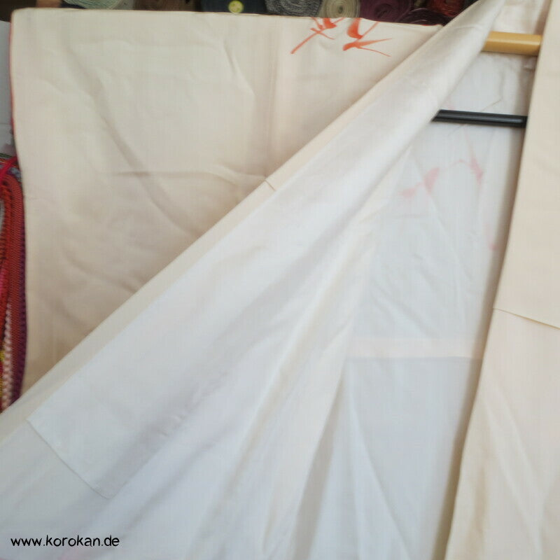 Vintage Homongi Kimono Seidencrepe mit riesigen handgemalten Bambusmotive, feinem oberen ehemals hellen Seidenfutter und unterem Hakkake mit rotem Verlaufsrand Seidenfutter.