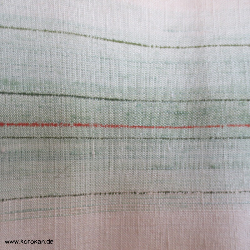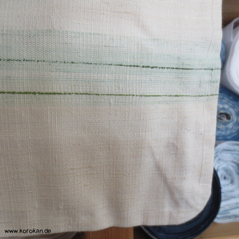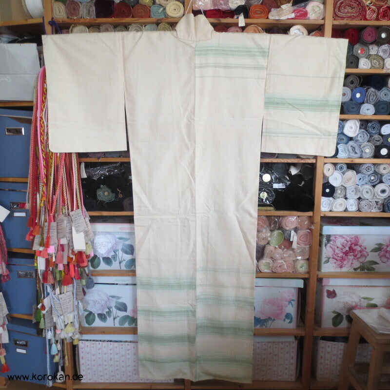 Vintage unbenutzter handgewebter Künstler Tsumugi Seiden Tsukesage Kimono feinste grüne Streifen eingewebt in grobe Naturseide, oberes Futter helle Seide, unteres Hakkake Futter Crepe Seide mit Bokashi Verlaufsrand.