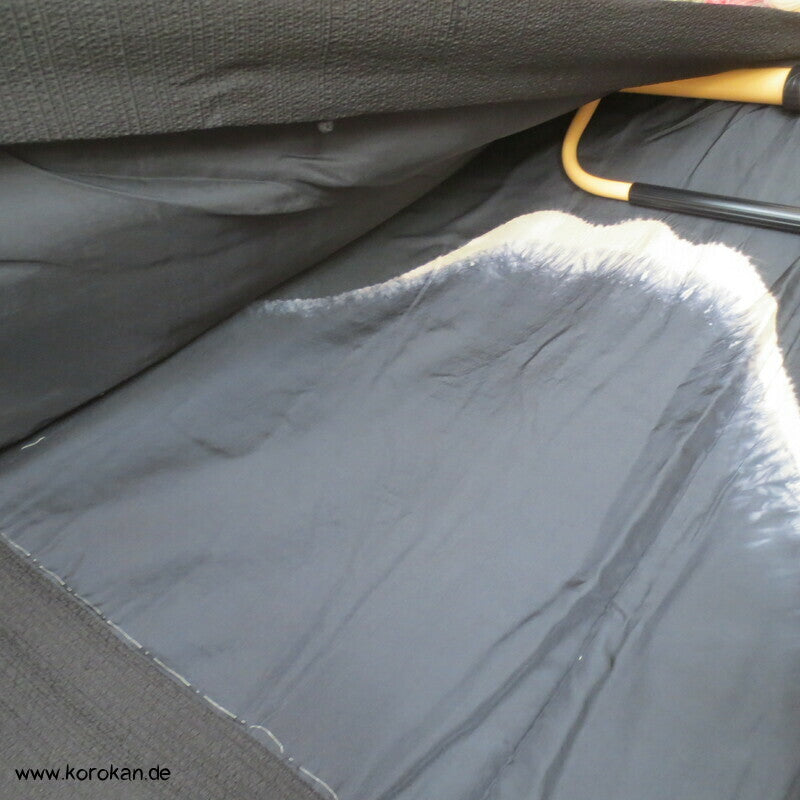 Vintage japanische Männer Haori aus schwarzer grob gestreift gewebter Tsumugi Seide mit Seidenfutter in dem ein gebatikter Fuji San zu sehen ist
