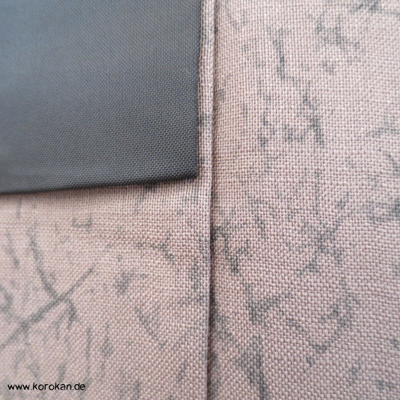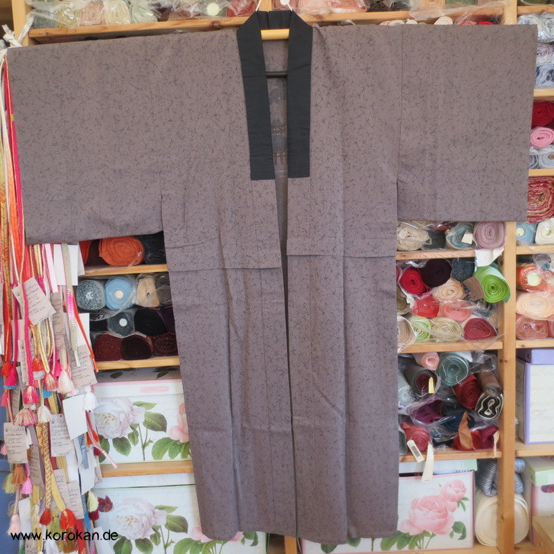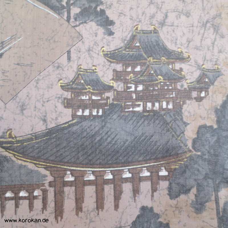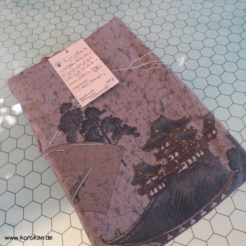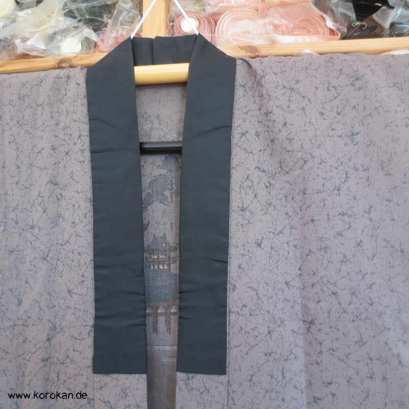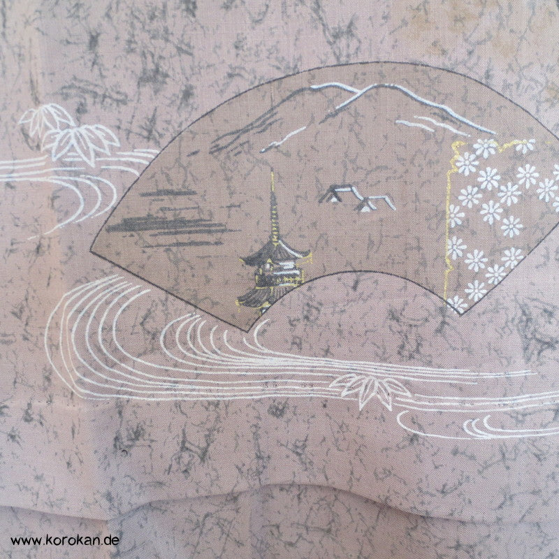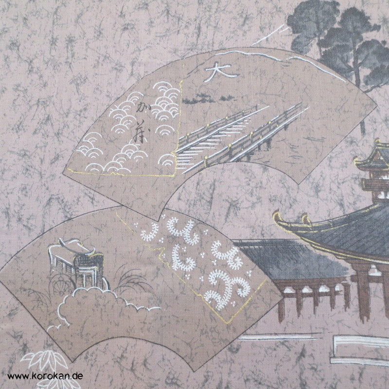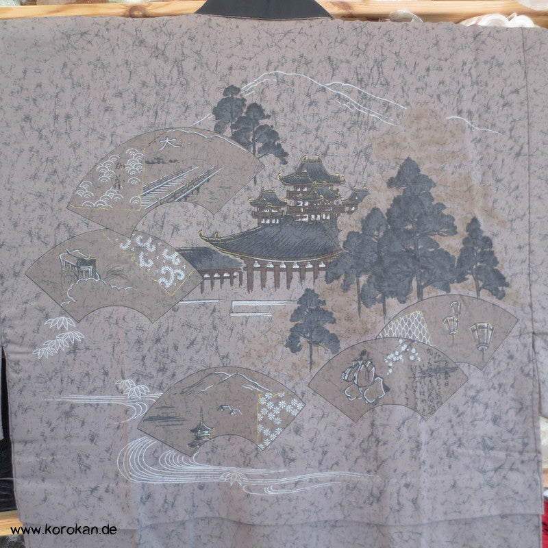 Vintage Männer Juban Unterkimono aus feinem weichen Woll Musselin bedruckt im Rücken mit einer Tempelanlage umringt von Bildfächern in graubeige, Kürzungsfalte in der Taille