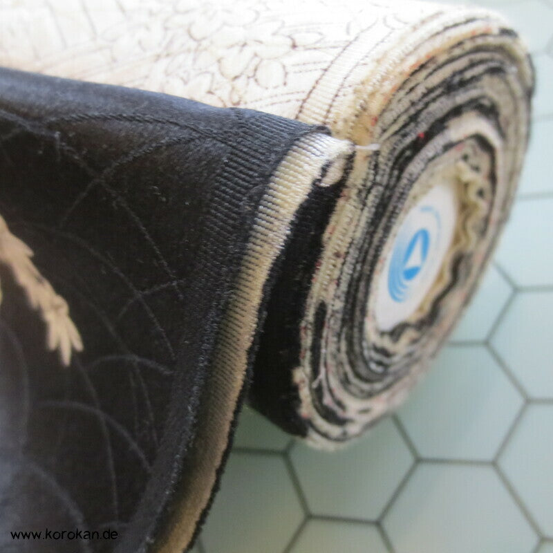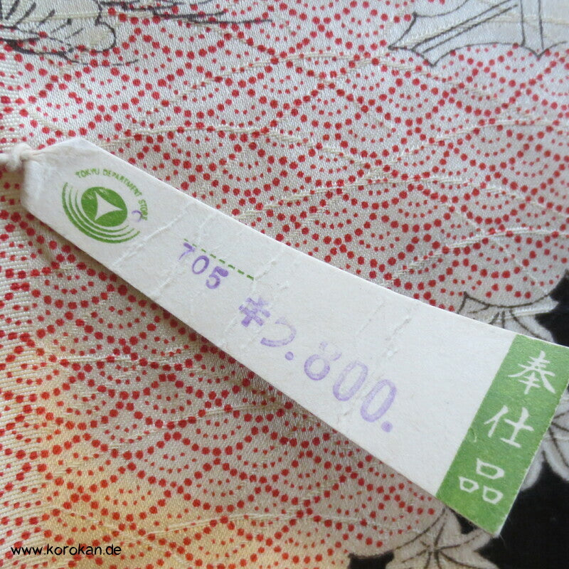 Vintage unbenutzter originalgehefteter Kimono Seiden oder Seide / Wolle Damast Basis schwarz mit gewebten Gräsern und einem Wolken Brücken Häuser Segaiha Druck.
