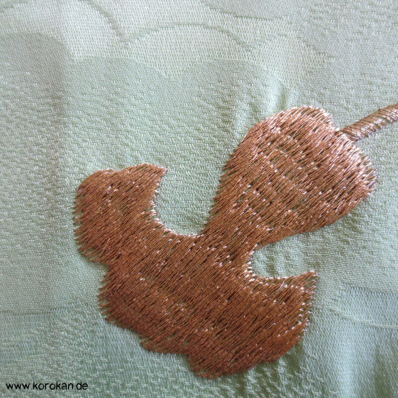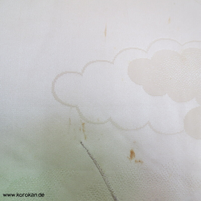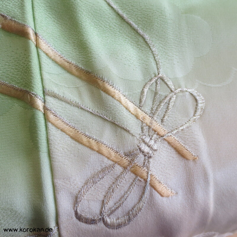 japanischer Vintage Furisode Wolken Seidendamast Kimono gestickte Blumen auf hellgrün schilfigem Grund, teilbestickt mit viel Goldauflage und Goldfäden